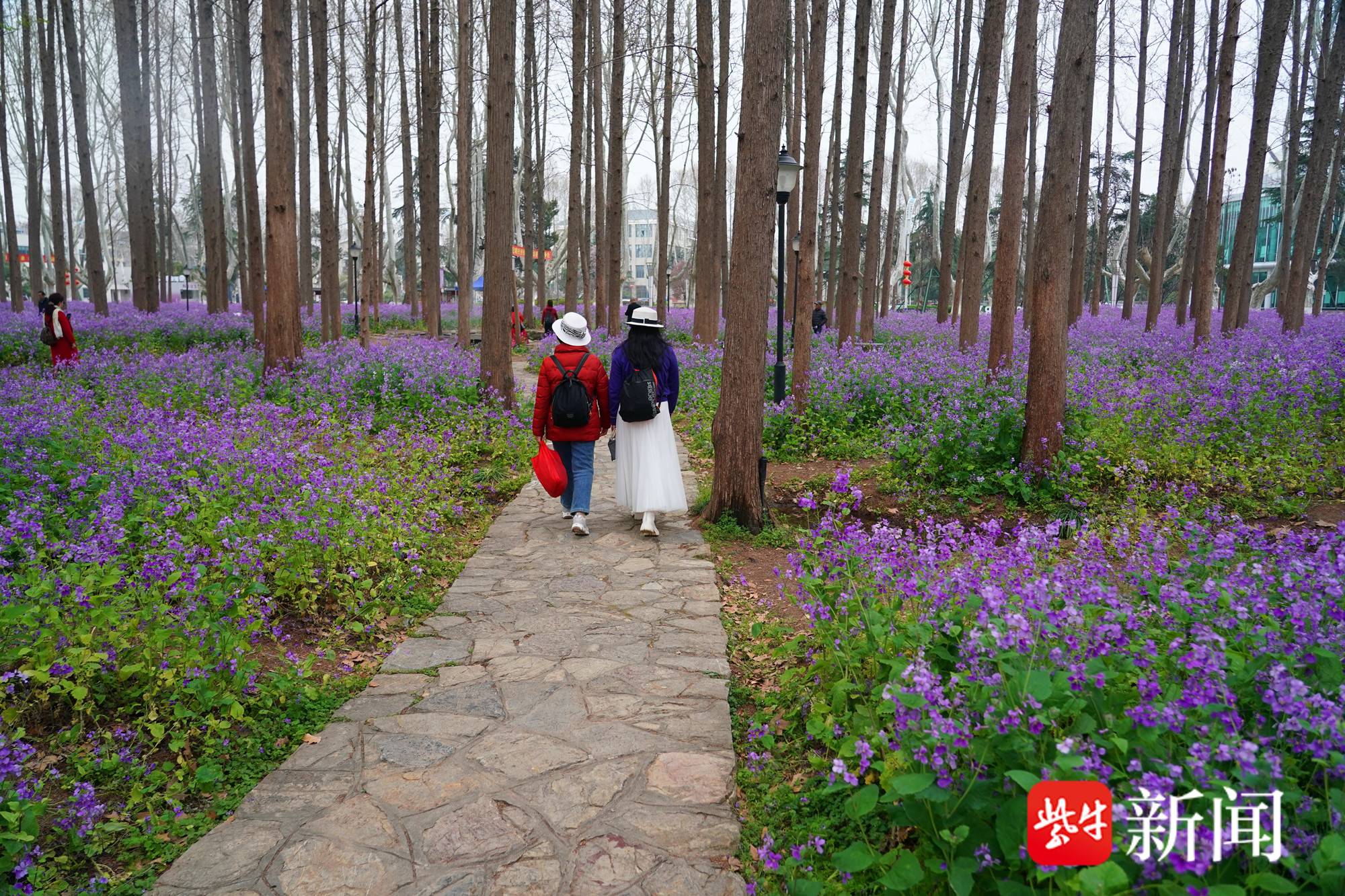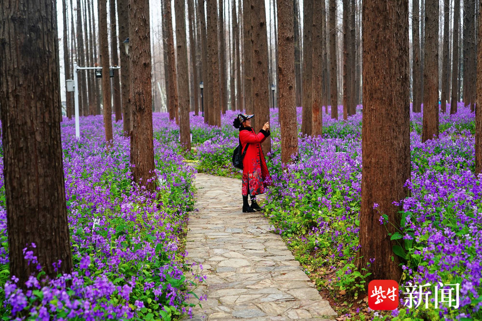 在校园里,树林间,成片的二月兰花朵连绵不绝,紫色连成片,如云似雾般铺满林地,与笔直的水杉相映成趣,给这所充满人文气息的校园再平添几分温柔与诗意。