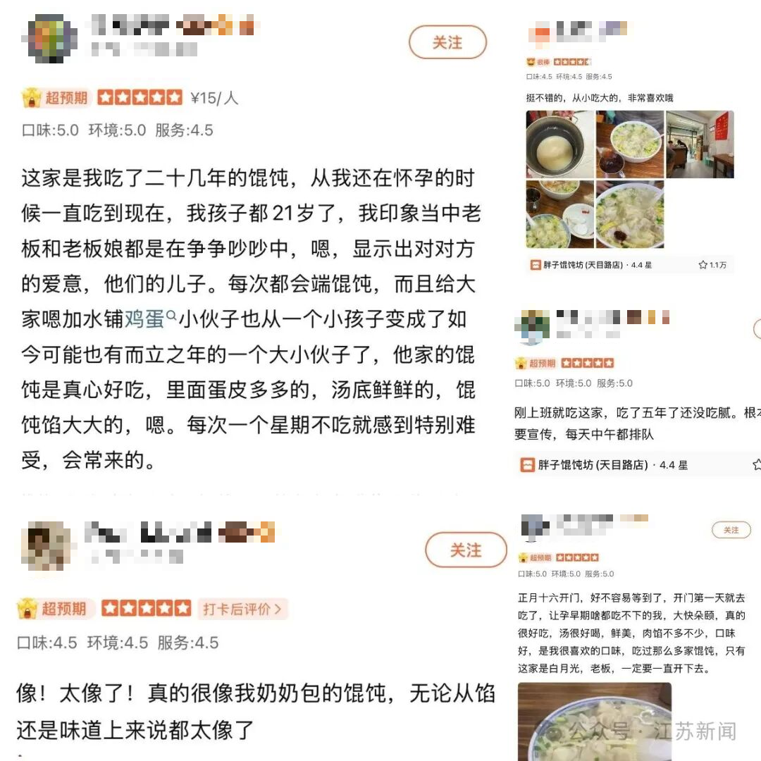 吃馄饨的客人,有的还会与门口的店主攀谈几句。原来店主姓吴,大家都叫她吴姐,1996年下岗后开了这家小店。小店一开就是近30年,按吴姐的话说:“馄饨一直保持老南京味道。”听旁边的顾客补充,胖子馄饨的忠实拥趸不乏名人,女排国手惠若琪、演员陶泽如都爱光顾。