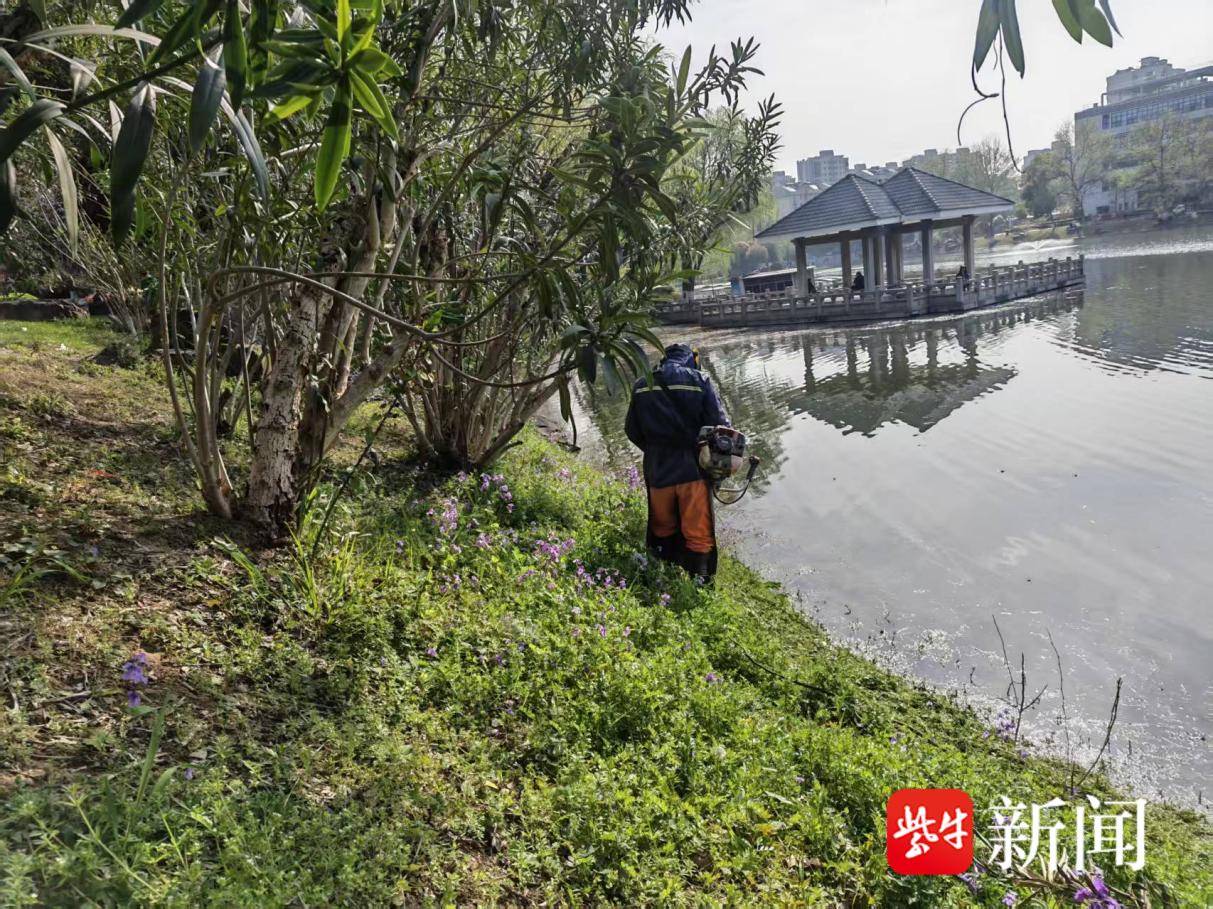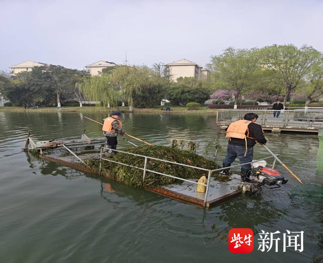 作业现场,专业割草船在河面灵活穿梭,精准切割水下及水面水草,完成收割、打捞、收集一体化作业,高效清理大面积水草区域;针对岸边等机械无法触及的死角,工作人员使用专业工具,细致清理残留水草,确保清理无死角、全覆盖。所有打捞上岸的水草均实行“即清即运”,统一转运至指定地点进行无害化处理,杜绝二次污染。