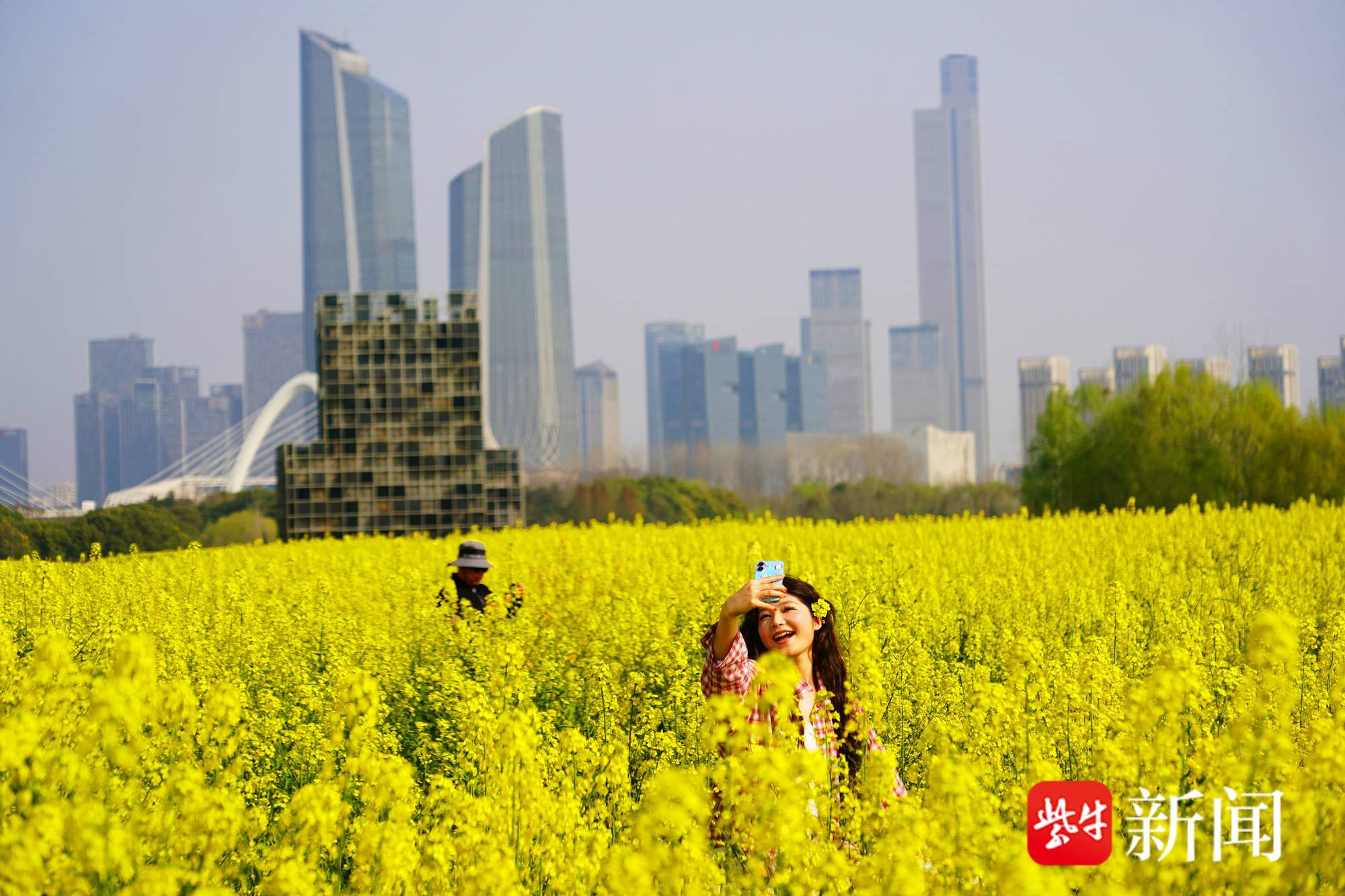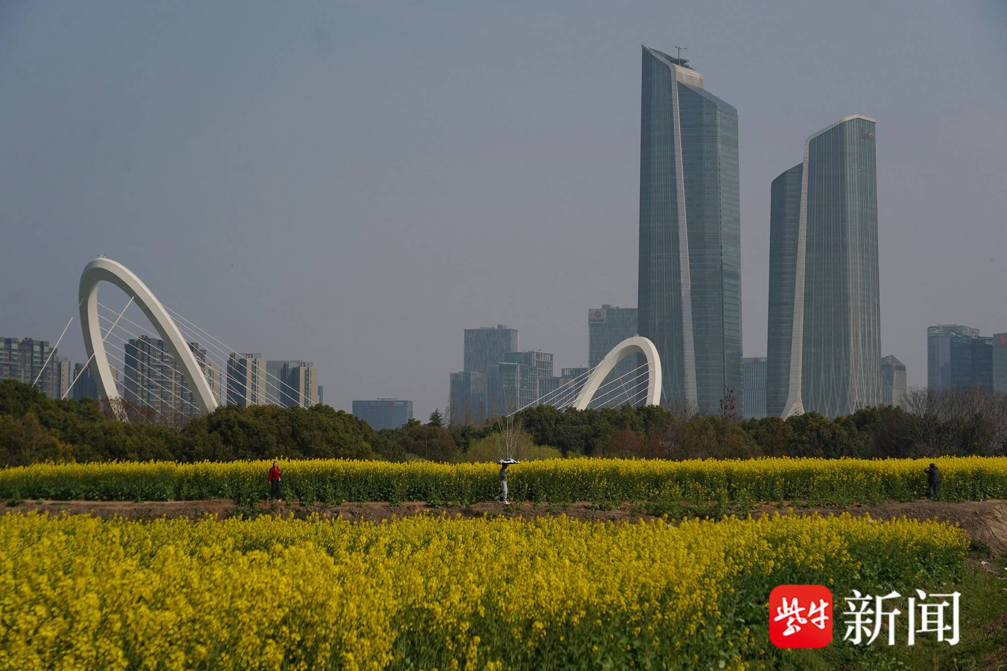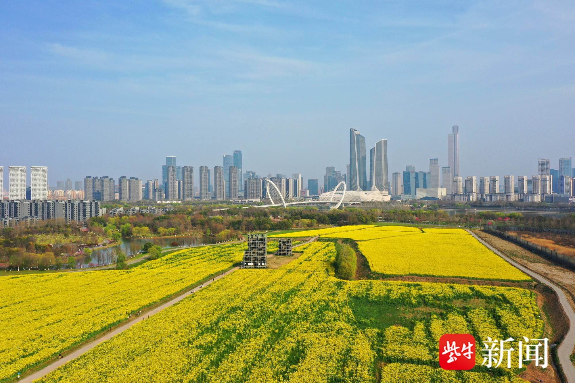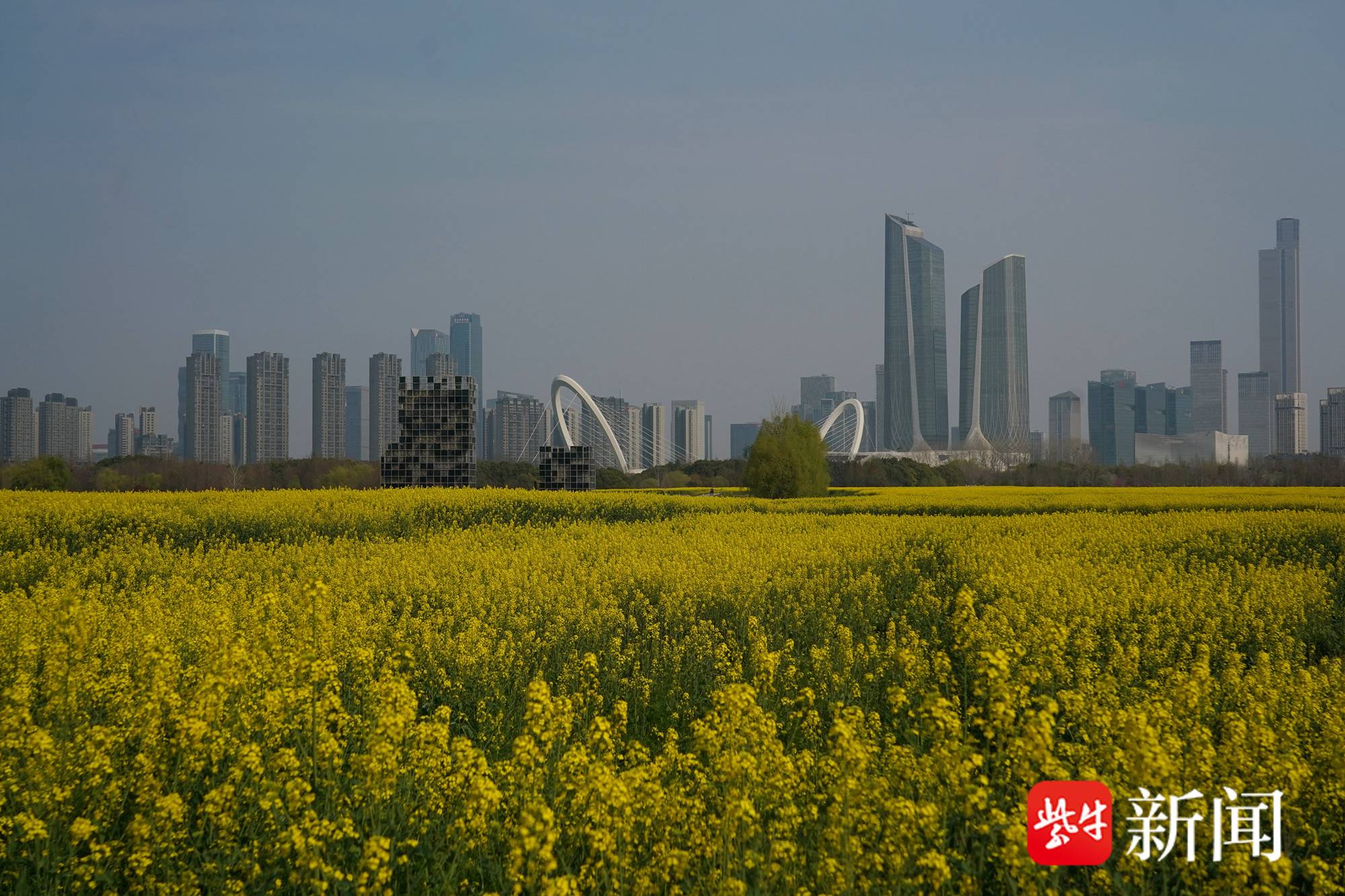 春风拂过,南京江心洲上的田间,金色浪涛层层翻涌,清甜的花香漫过田埂,与远处鳞次栉比的高楼、错落有致的城市天际线相映成趣,勾勒出一幅层次分明、美轮美奂的都市田园画卷。