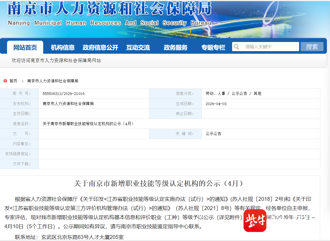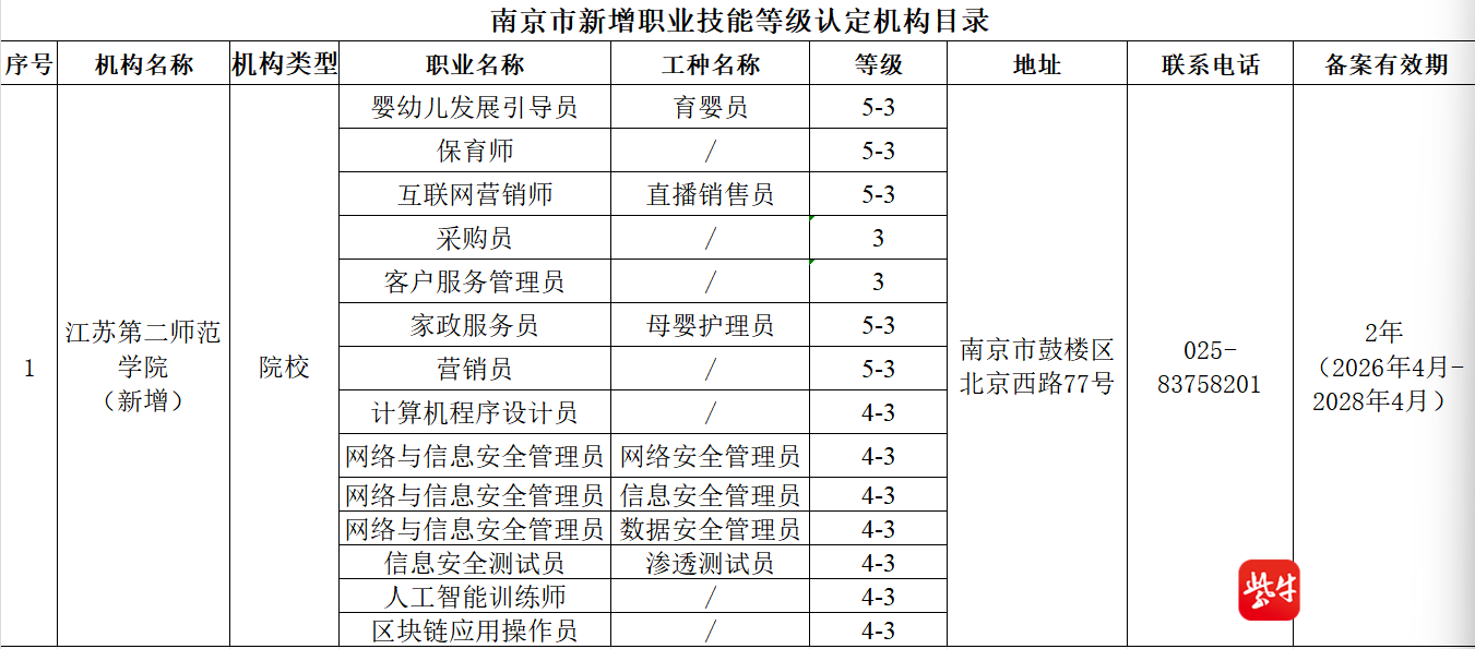 扬子晚报网4月4日讯(记者 闫春旭)4月3日,南京市人力资源和社会保障局发布《关于南京市新增职业技能等级认定机构的公示(4月)》,新增江苏第二师范学院为职业技能等级认定机构,并同步公布其可开展的评价职业(工种)等级,包括直播销售员、网络安全管理员、渗透测试员等多个工种。公示时间为2026年4月3日—4月10日,共5个工作日。公示期间如有异议,请与南京市职业技能鉴定指导中心联系。联系地址:玄武区北京东路63号人才大厦205室。联系电话:025-83370610。