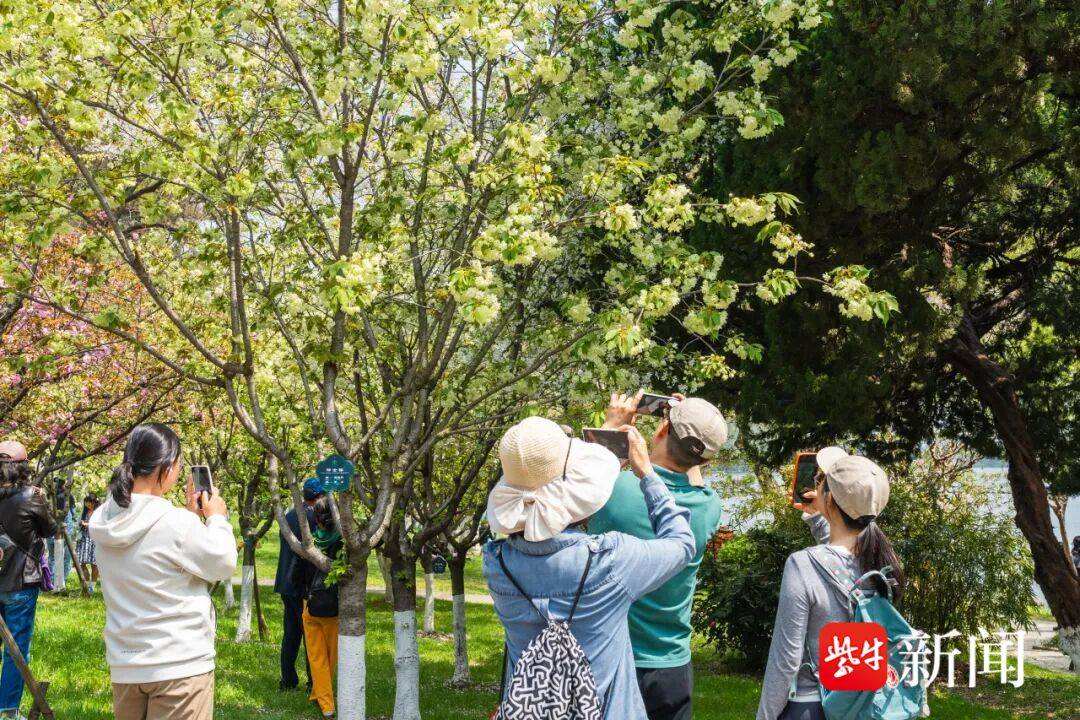 更稀奇的是,绿色家族中还有一些花卉“稀客”。如今玄武湖绿色樱花“郁金樱”也正悄然绽放,这种罕见的樱花品种花瓣呈淡绿色,远望如翡翠缀枝。不少游客围在树下拍照,连连称奇:“第一次见到绿色的樱花,太梦幻了!”
