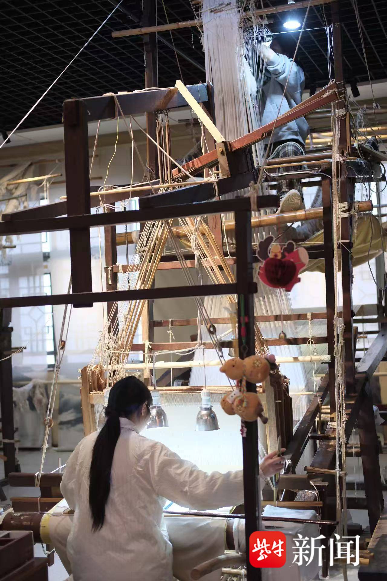 记者看到,馆内最吸睛的是那架大花楼木织机。一位老匠人端坐机前,手脚并用,梭子来回穿梭,丝线在阳光下泛出柔光。但真正让年轻人驻足的不是织机本身,而是旁边的互动数字屏——手指轻点,织造工艺便以三维动画逐层拆解,复杂的“通经断纬”一目了然。云锦博物馆新馆还创新打造了“龙袍动画演绎”“大花楼木织机三维解析”等四大数字化沉浸展项,将织造工艺转化为可感知的生动体验。