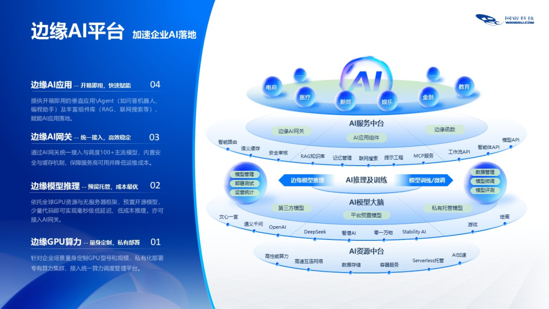 近年来,网宿科技积极拥抱人工智能浪潮,全面升级边缘AI平台,构建起集“模型接入—推理优化—场景落地”于一体的全链路技术体系,成功推动大模型从技术概念向影视、医疗、制造、教育、家居等行业落地,实现规模化生产力转化。