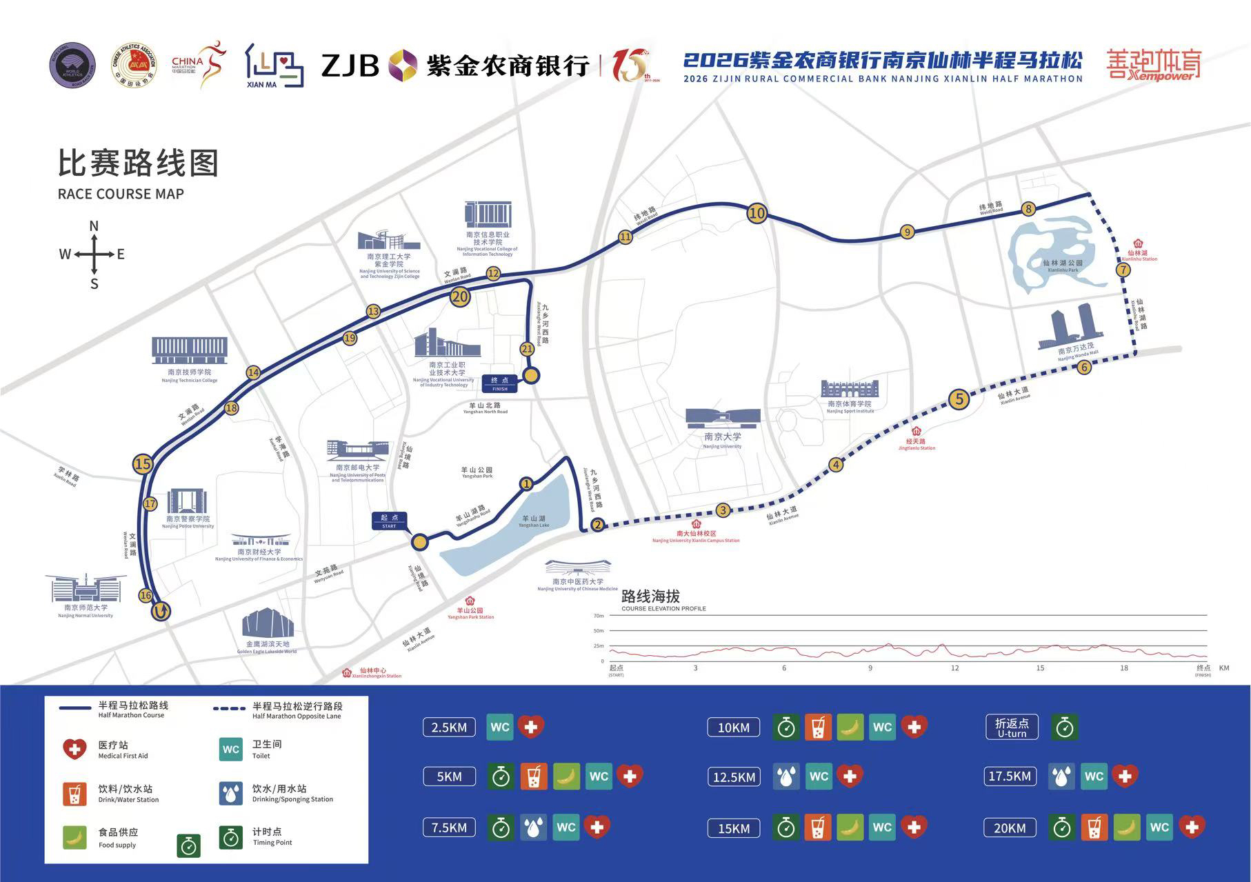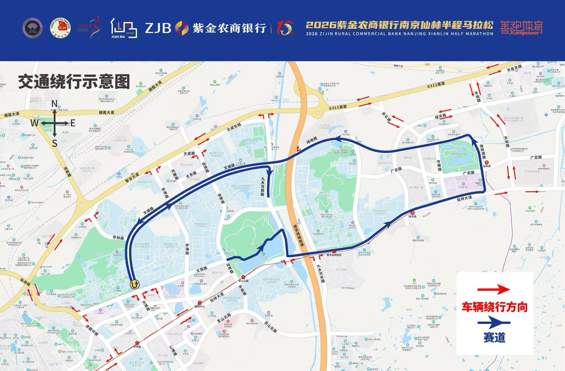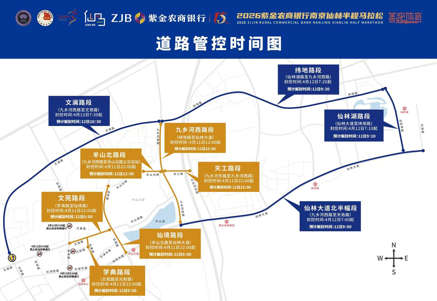 根据起终点设置需要,九乡河西路段(纬地路至仙林大道)4月11日12:00起至比赛结束,仙境路段(羊山北路至仙林大道)、文苑路段(学海路至仙境路)、学典路段(文苑路至元和路)、羊山北路段(九乡河西路至羊山北路公交总站)、天工路段(九乡河东路至九乡河西路)4月11日22:00起至比赛结束,上述双向道路实行临时交通管控,禁止机动车辆通行。