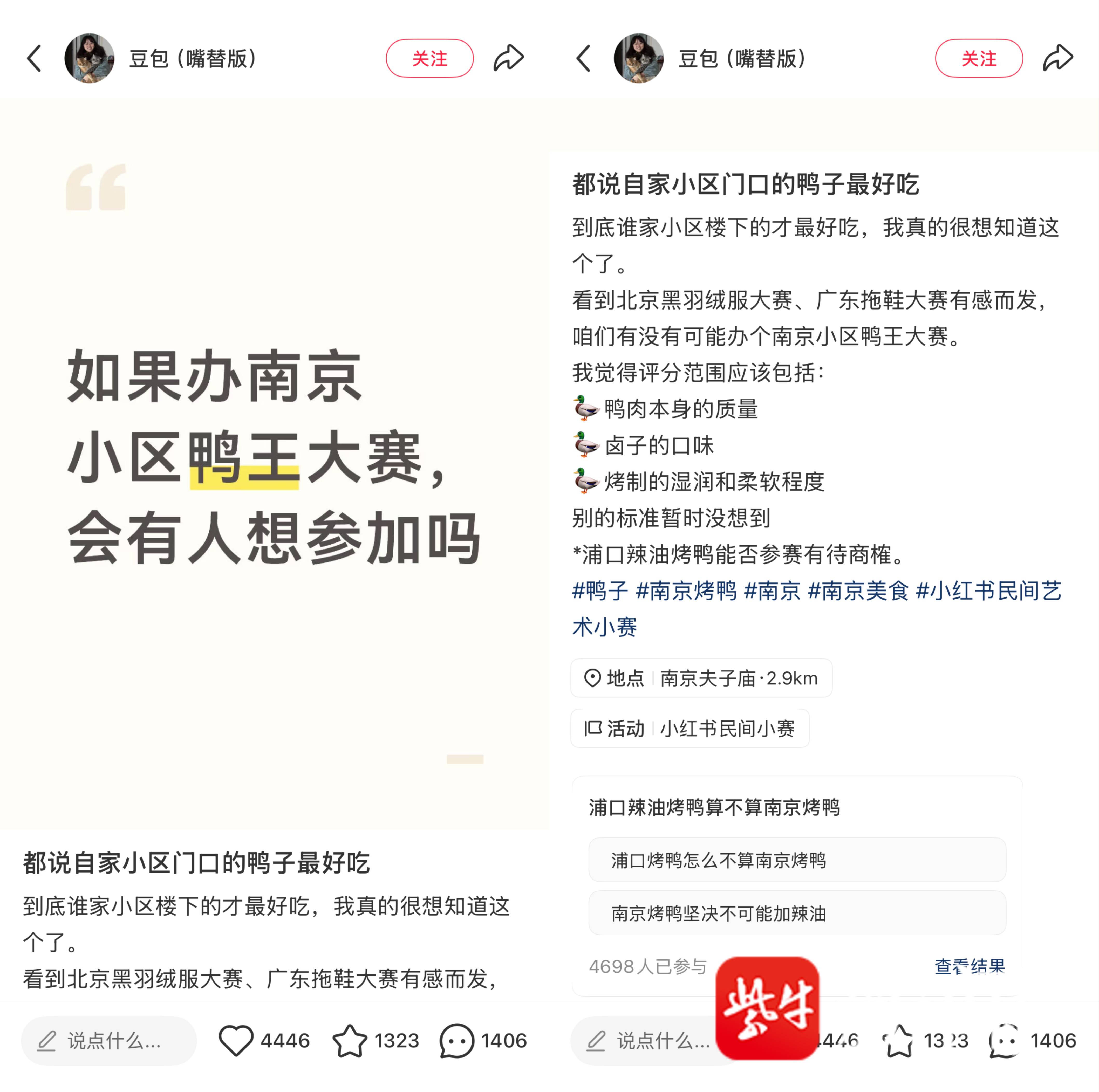 比赛发起人是网名“豆包”的年轻女孩。不久前,她看到北京黑羽绒服大赛、广东拖鞋大赛,有感而发,在社交媒体上发了一篇生活笔记。评论区迅速聚集起数百条留言,有人强推玄武湖附近的老字号,有人力挺秦淮区的巷弄小店……不少网友支持:“不如办场南京鸭王大赛比一比!”