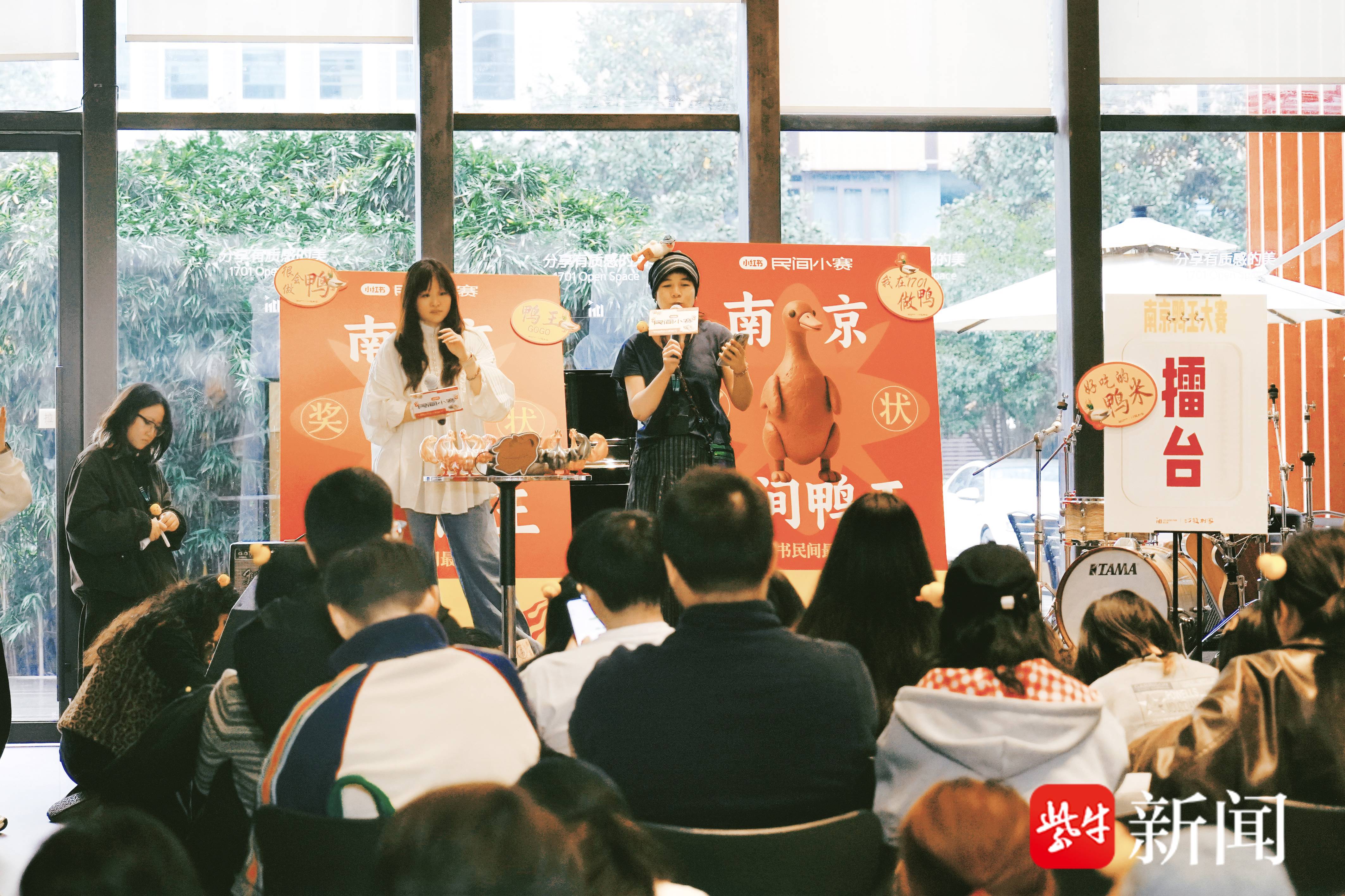 4月11日下午,记者来到南京雨花台区1701 Live House,见证了这场由一群年轻人自发组织的“南京鸭王大赛”。网友们共推荐了138家鸭子店,最终37位推荐人走上舞台,用讲故事、唱rap等“花式整活”方式介绍自己心中“最好吃的鸭子店”,接受台下来自全国各地食客的“检阅”。