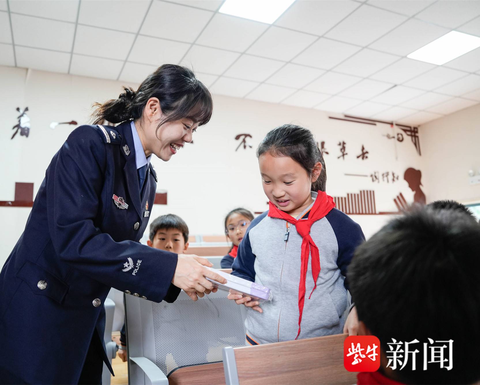 图为民警为同学送上奖品