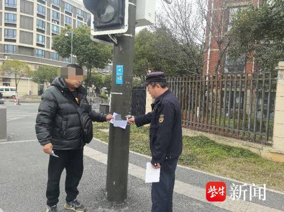 当日中午12时许,沿江大队巡查队员对辖区主次干道、交叉路口等重点区域开展常态化巡查,在侨康路与兰山路交叉路口,巡查队员发现一名男子手持一沓小广告,快速在路边公交站台、路灯杆等公共设施上张贴,动作隐蔽且迅速。