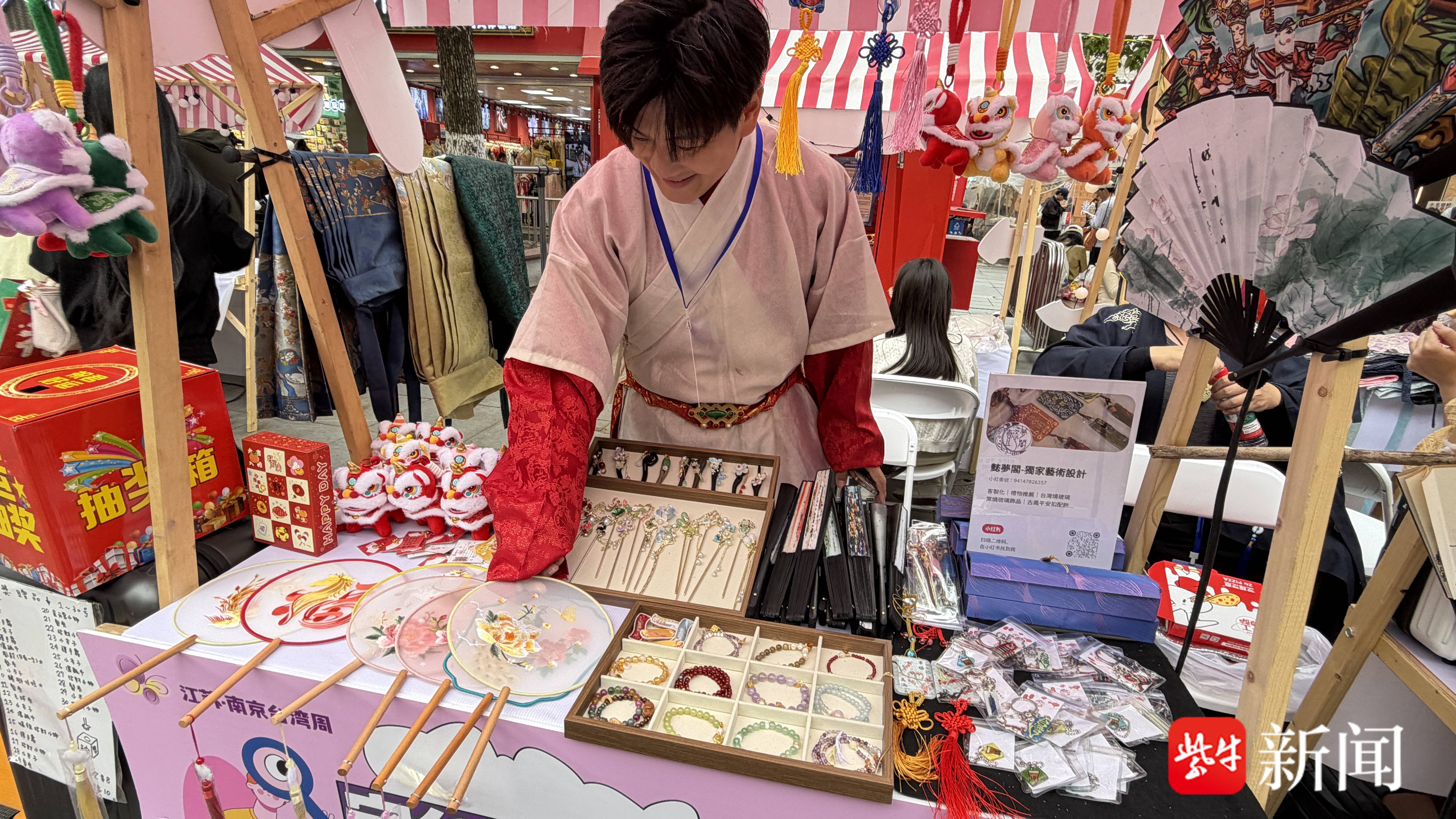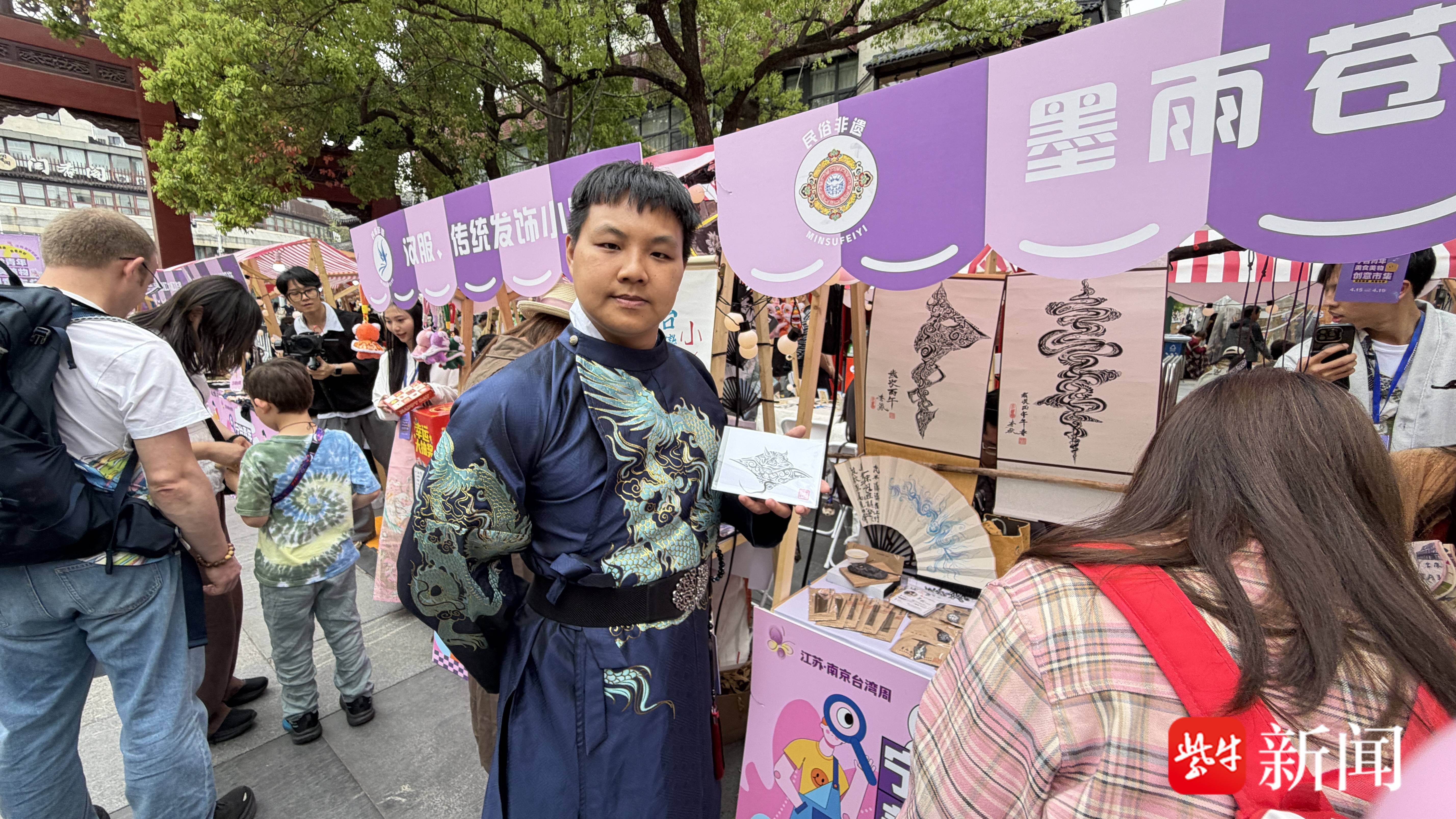 在熙攘的人群中,首次来到南京的台湾青年创业者吴旻义,他身穿汉服热情地向游客介绍摊位上的手工作品。他对这座城市充满好感:“南京人很亲切,让我觉得很温暖。”