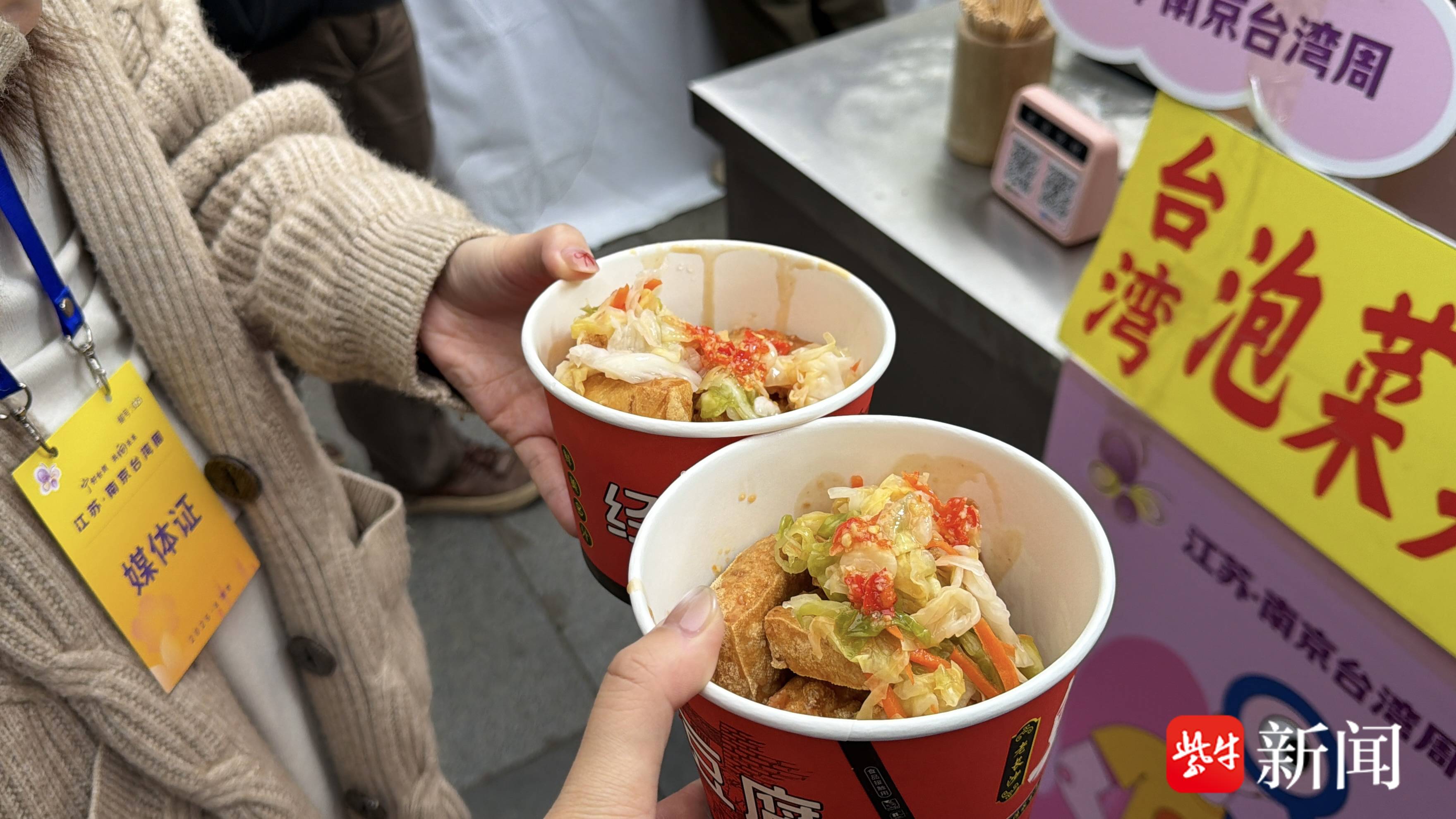 “咣!”一声清亮锣响,市集正式迎客。近四十个两岸特色摊铺在夫子庙北广场整齐排布,“民俗非遗”打卡点、“共同记忆”合影牌、“宁台美食”展示墙等主题装置交错其间,创意十足。空气中弥散着台湾蚵仔煎、泡菜臭豆腐、烤香肠的香气,“旺旺”“康师傅”等深耕大陆的台企品牌唤醒了两岸共同的“儿时味道”。在“两岸民俗非遗共创区”,金陵绒花、南京雨花茶与台湾客家蓝染、缠花同台竞艳,吸引众多市民驻足流连。