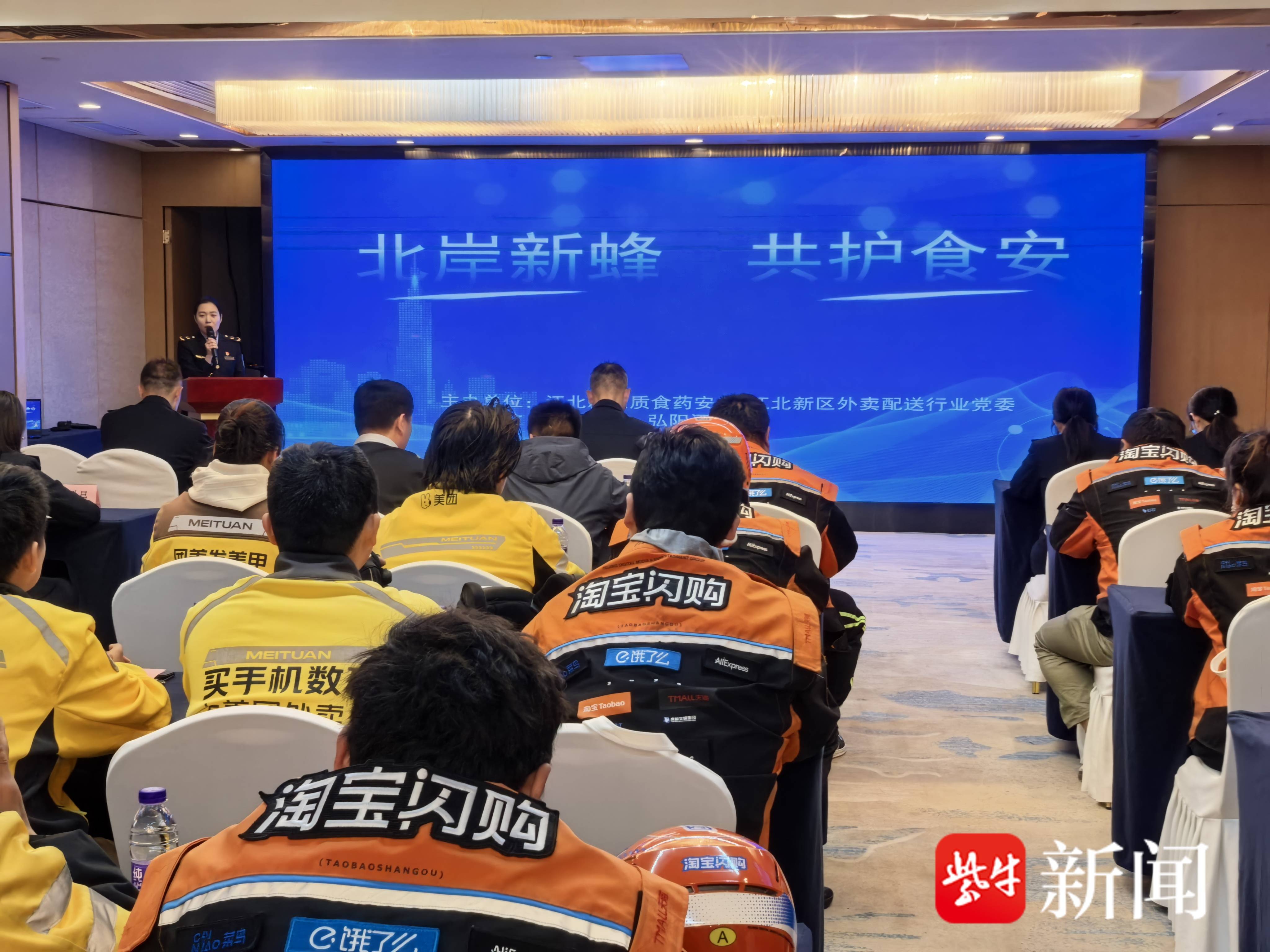 扬子晚报网 4月17日讯(记者 姜婧仪 通讯员 王沐婉) 4月17日下午,南京江北新区市场监管局开展“北岸新蜂 共护食安”主题活动,新区市场监管局分管领导、党建办、食品办、各相关分局负责人、6名网约配送站(队)负责人及24名外卖骑手志愿者齐聚一堂,共同开启外卖骑手参与网络餐饮食品安全社会共治新模式,筑牢新区食品安全防线。