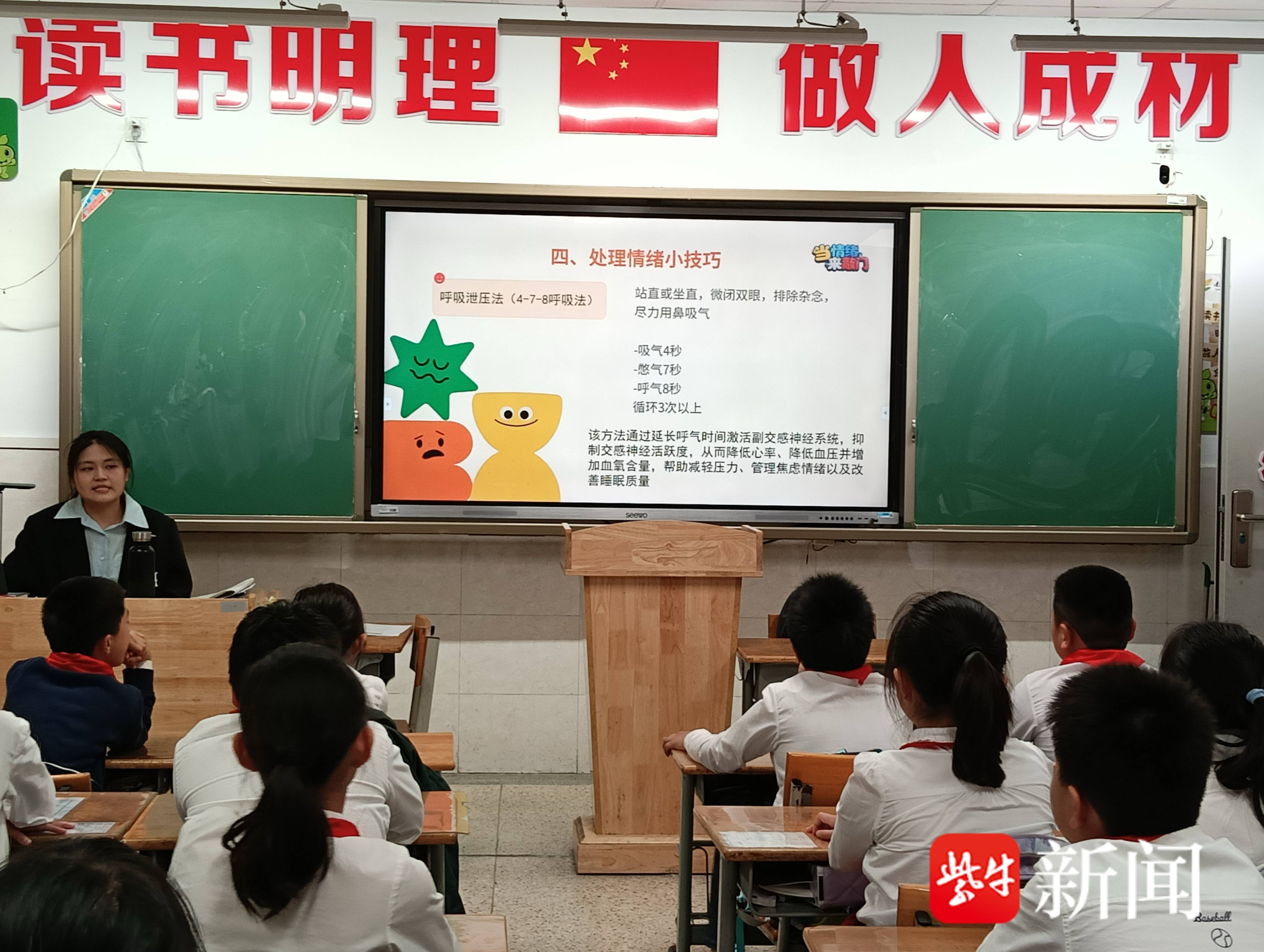 孩子们一边认真记下知识点,一边跟着老师的引导现场做放松练习,有的同学听完就迫不及待地分享说:“下次我生气的时候,就先数10个数再说话!”