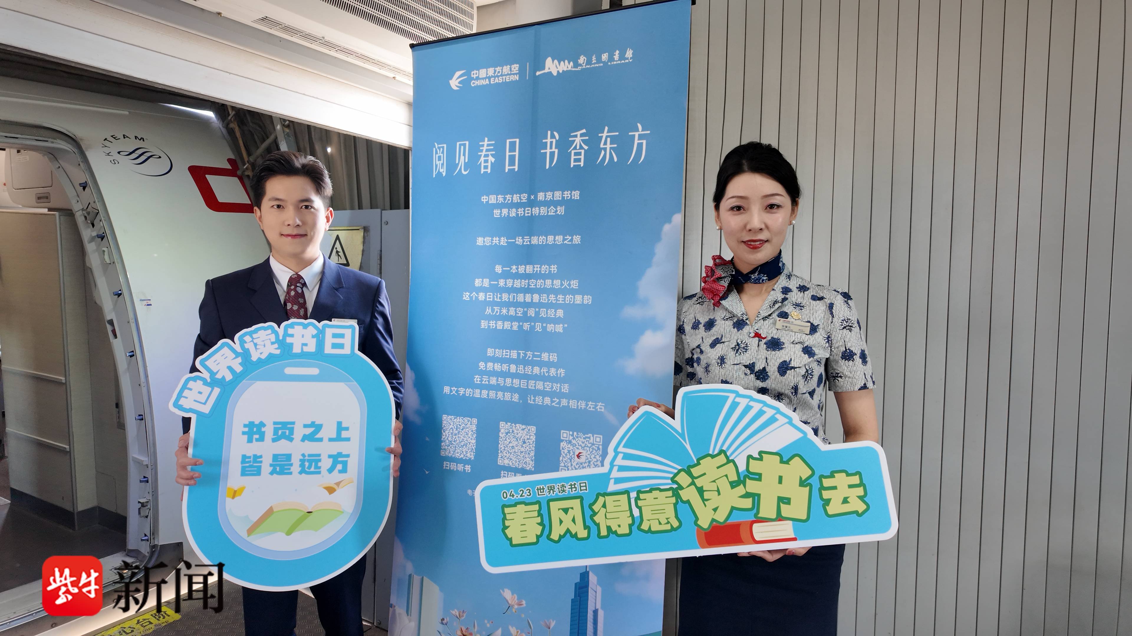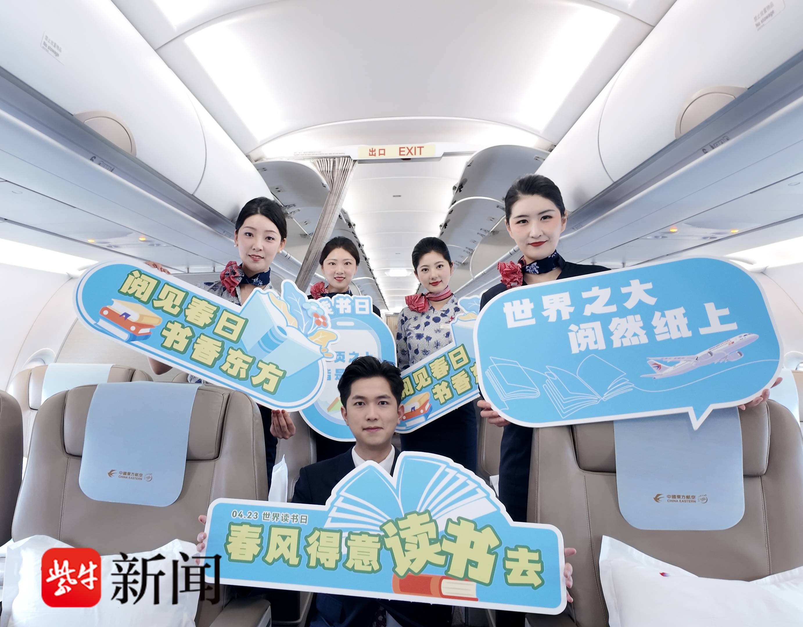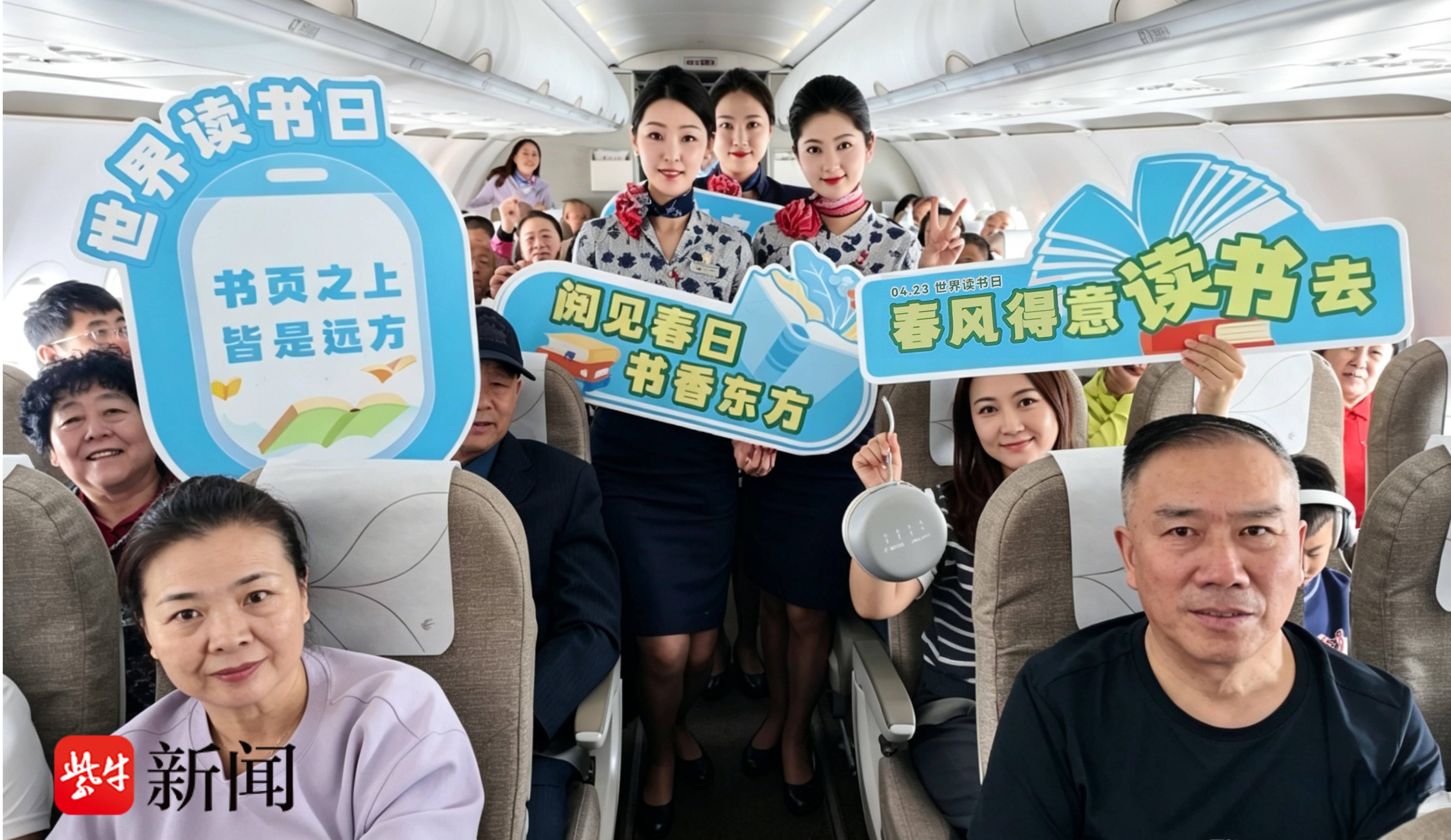 “欢迎您乘坐东航与南京图书馆联名的‘世界读书日’主题航班!”舱门口,乘务组面带微笑向每一位旅客致以问候,她们手上拿着“春风得意读书去”“书页之上皆是远方”等诗意标语,让不少旅客拍照留念。“这个创意太用心了,一下子就把旅途的惬意和阅读的静谧结合起来,很有氛围感。”旅客汪先生点赞道。