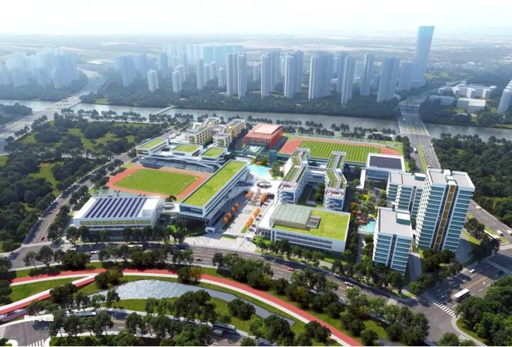 南师附中江北新区学校高中部位于江北新区核心区域,东至七里河大街、南至横江大道、西至七里河、北至九袱洲路,占地约13万平方米,总建筑面积超19万平方米,包含教学楼、图书馆、风雨操场、音乐厅等设施。