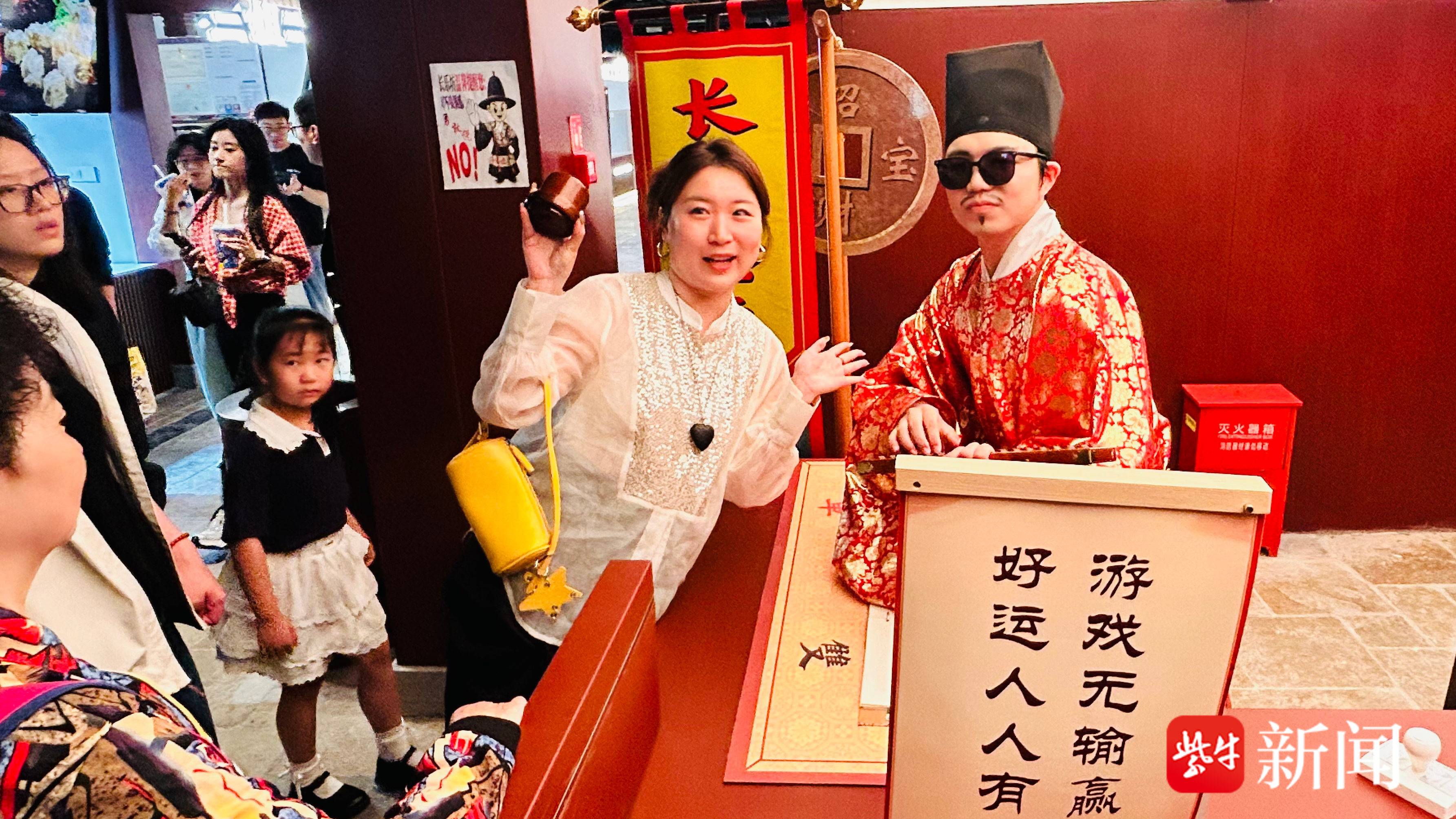 走进金陵长乐坊,明代文化的氛围感扑面而来:近百盏明代形制宫灯挂满坊巷,空中横跨的龙门桥上,汉白玉柱雕饰的“二龙戏珠”栩栩如生,三只巨型鲤鱼灯盘旋其上,寓意“鱼跃龙门”。身着汉服的游客手持通关文牒,与锦绣娘、陆昭等NPC热情互动,不时驻足观看非遗手作展示,空气中既有江南小吃的香气,也有传统文化的韵味。