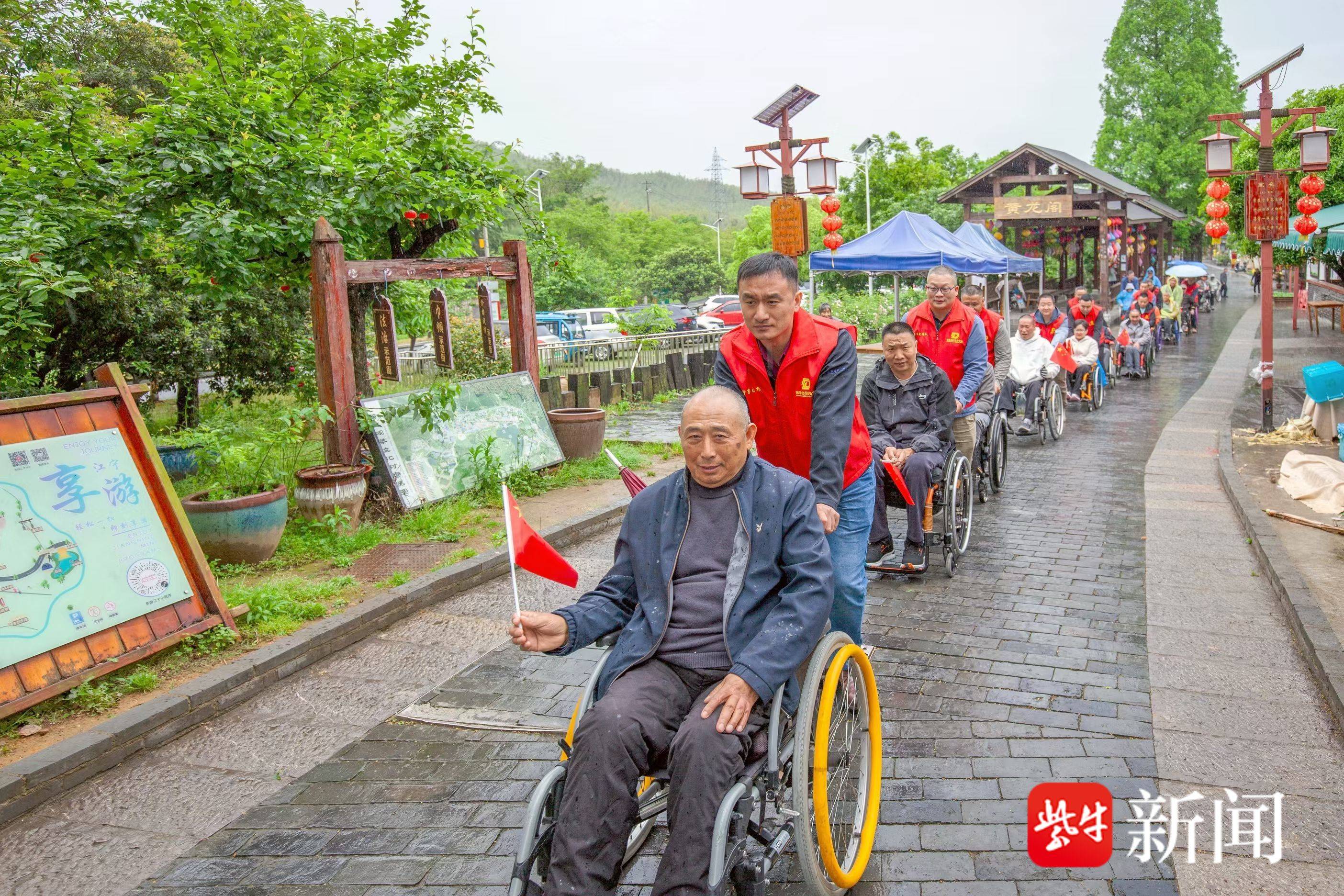 午餐后,近20位脊髓损伤者乘坐轮椅,在家属与志愿者全程帮扶下,悠然畅游江宁黄龙岘美丽乡村。景区无障碍设施完善齐全,轮椅通行畅行无碍,让大家彻底放下顾虑,沉浸式投入大自然的怀抱,尽享青山绿意、乡野清风。
