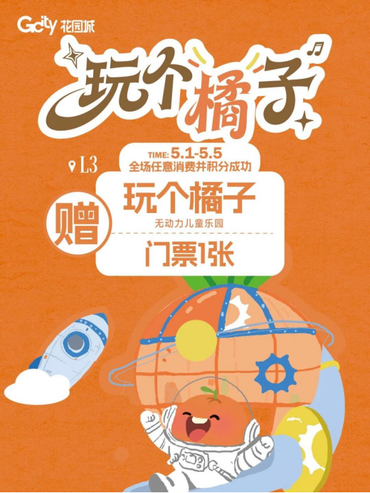 5月1日-5月5日,面向亲子客群,玄武花园城推出消费/凭票根赠儿童乐园门票活动。全场任意消费并积分或凭来宁交通/景点/赛事票根,即可免费获赠L3层“玩个橘子”无动力儿童乐园门票,以丰富亲子游乐设施,打造安全、舒适、趣味十足的家庭消费空间,满足市民与游客假期遛娃需求。
