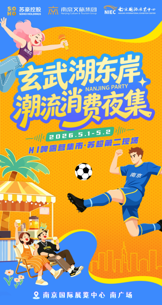 5月1日-5月2日,南京国际展览中心南广场将再度化身为苏超“第二现场”,重磅回归的“玄武湖东岸潮流消费夜集”以“赛事+音乐+市集”的复合体验,解锁“看球+听歌+逛吃”的一站式快乐。