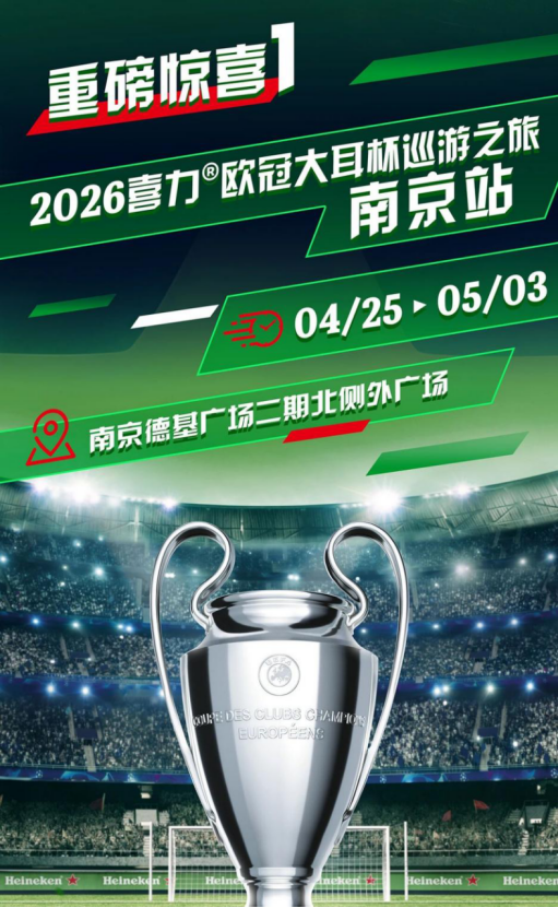 4月25日-5月3日,在德基广场二期北侧外广场,2026喜力欧冠大耳杯巡游之旅首站,让你现场沉浸式感受欧冠热潮;完成集章即可兑换好礼,整点抽取菲戈见面会门票、亲签足球/球衣;德基广场任意消费满888元可凭小票参与抽奖。