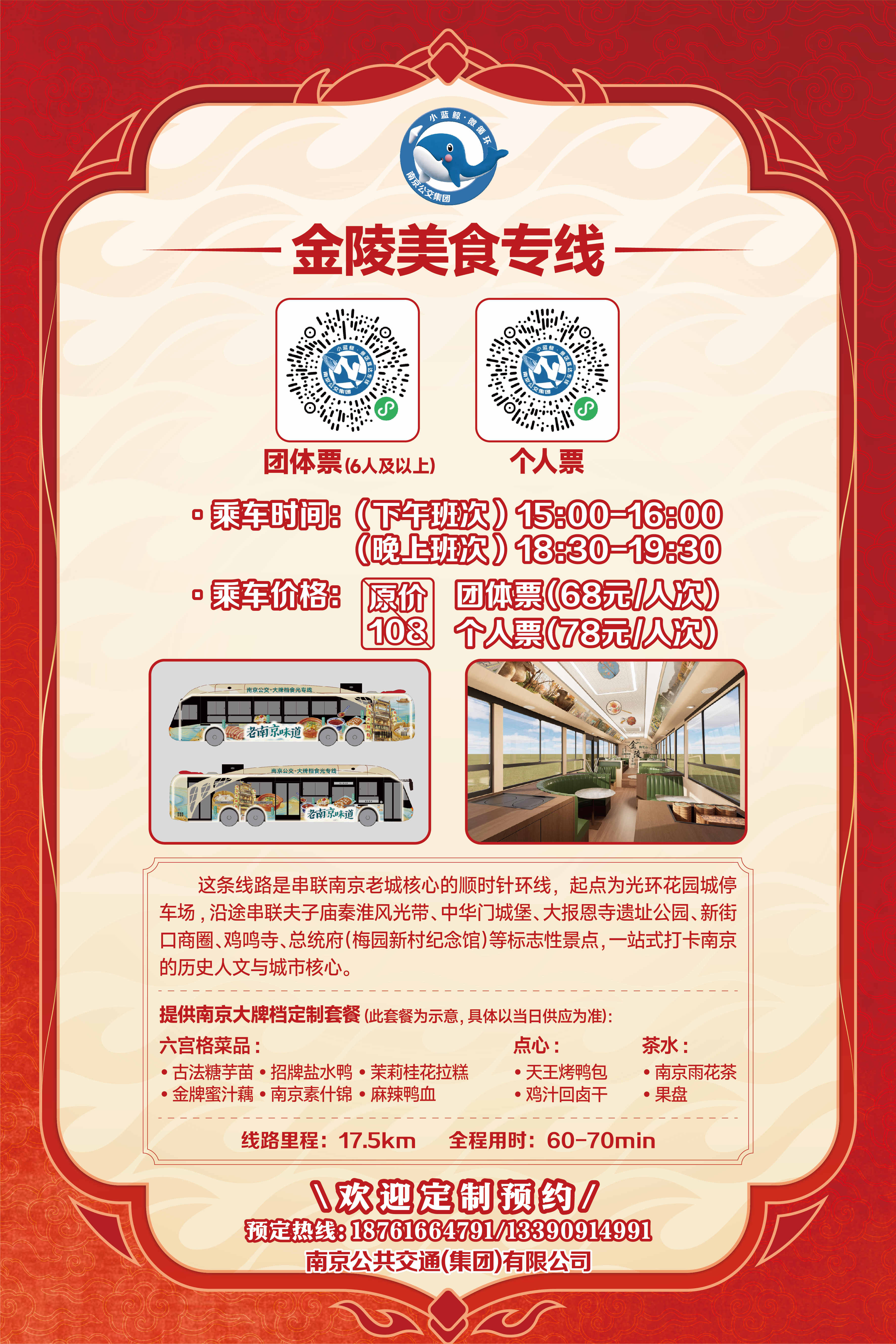 南京公交精心打造的“金陵巴士·食光专线”将于5月1日正式上线运营。专线将地道金陵美食与流动的城市风光无缝衔接,开启“观光+美食”的全新出行体验。售价为团体票68元/人次、个人票78元/人次,包含了车票和餐食。