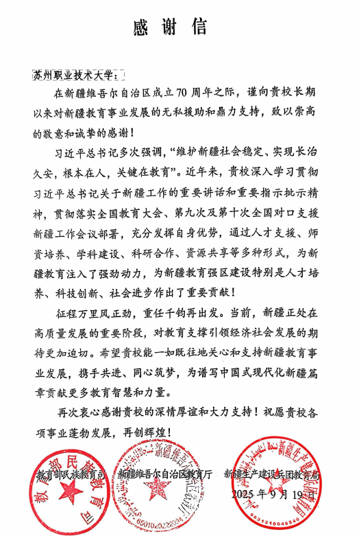 在新疆维吾尔自治区成立70周年的重要节点,教育部民族教育司、新疆维吾尔自治区教育厅、新疆生产建设兵团教育局联合向苏州职业技术大学发来饱含敬意的感谢信,对学校长期以来支援新疆教育事业的无私奉献与鼎力支持给予高度肯定。这封跨越千里的感谢信不仅是对学校援疆工作成效的高度认可,更映照出苏州职业技术大学作为职业本科院校,深耕中西部对接帮扶、践行教育使命的责任担当。