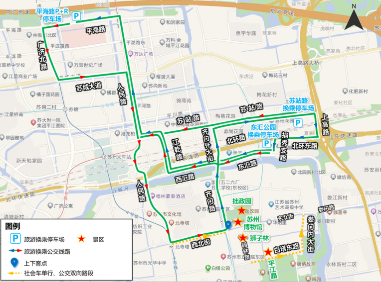 三大停车场换乘“姑苏旅游公交”示意图