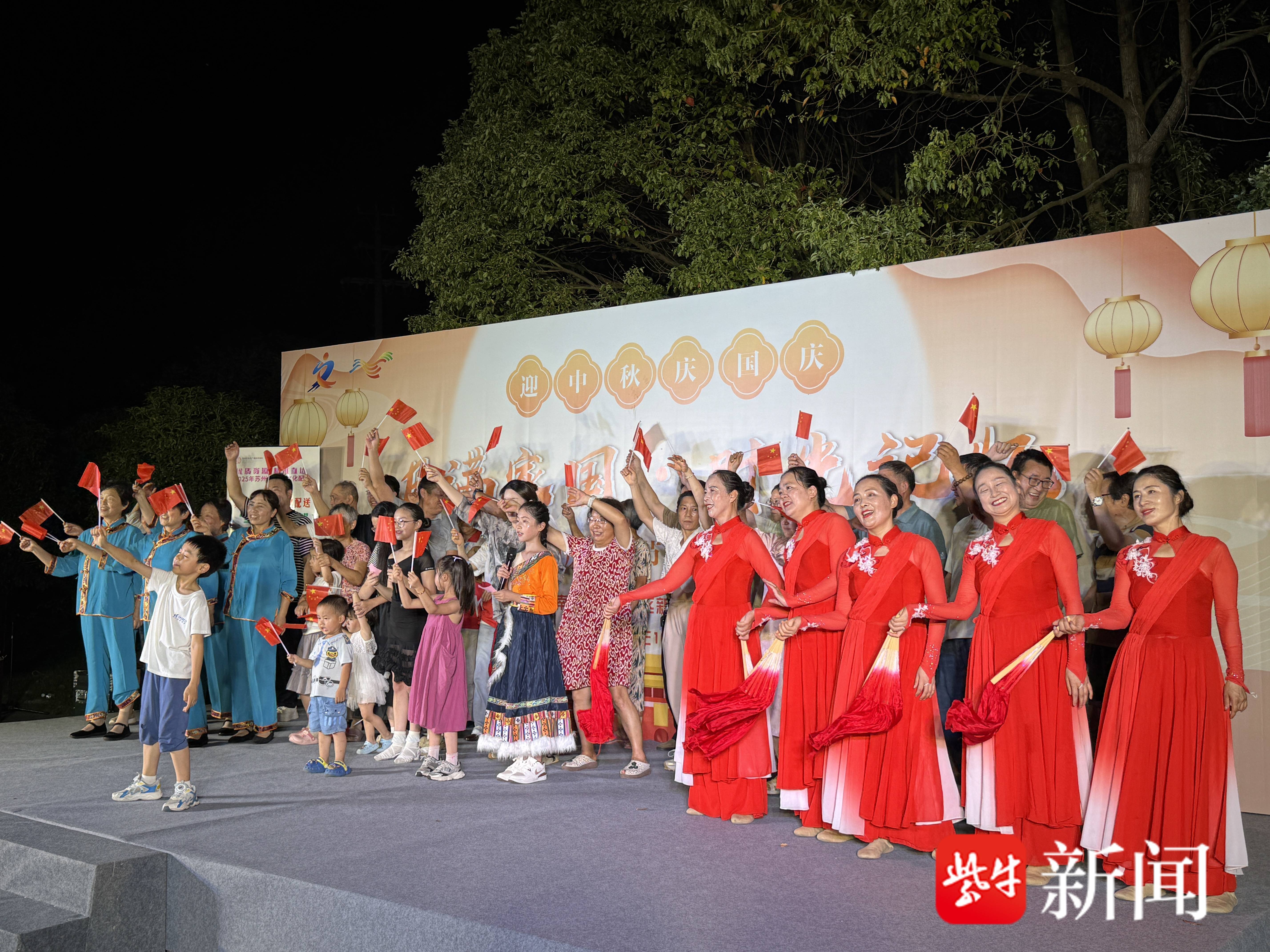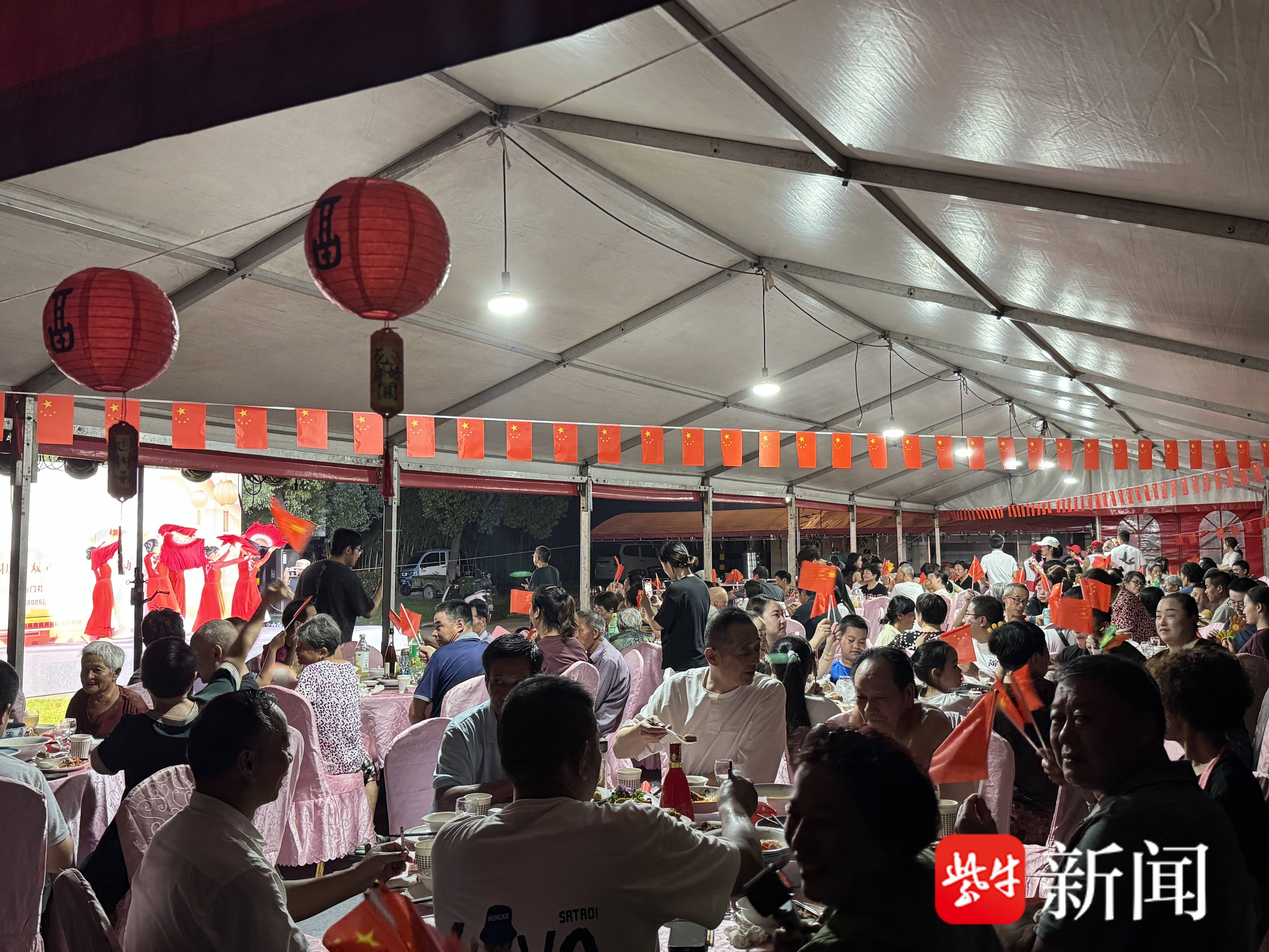 宴席前方,临时搭建的舞台虽不华丽,却承载着最真挚的情感。村民自编自演的节目、镇文化站带来的表演、孩子们纯真的合唱接连上演。台下,村民们一边夹菜,一边鼓掌喝彩,不时拿起手机记录下这欢乐的瞬间。没有专业的编排,却有着最接地气的真诚。宴席的高潮在全场齐声高唱《我和我的祖国》时自然涌现。村民们自发挥动着手里的国旗,歌声或许不够整齐,却情感澎湃。