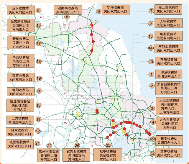 1.由北往南方向:南京八卦洲长江大桥、沪苏通大桥、苏通大桥,G2京沪高速扬州段,G15沈海高速连云港、盐城、南通段,G25长深高速连云港、淮安、南京、灌南段,S19通锡高速南通段,S35阜溧高速泰州、镇江段,S39江宜高速常州段,S49新扬高速宿迁、淮安、扬州段。