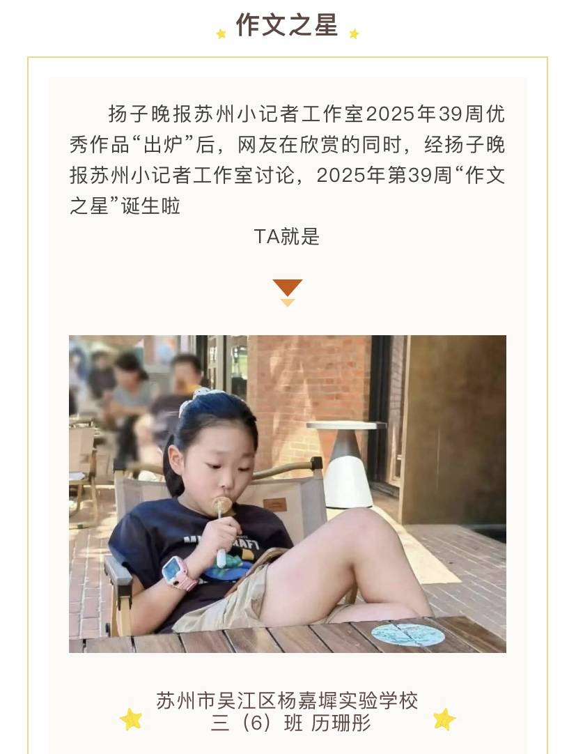 “她有一双水汪汪的眼睛,忽闪忽闪的,好像会说话一样,还有一张红润的樱桃小嘴,漂亮极了。”这样生动、细致的人物描写出自苏州市吴江区杨嘉墀实验学校三(6)班历珊彤的《猜猜她是谁》。文中,她用富有童真的笔触描绘了她心目中最喜爱的语文老师美丽、细心又专业的人物形象,让我们仿佛能够透过文字看到那位“每天都比我们早到学校,读书时时而情欢、时而激昂”的语文老师,也让她斩获了本年度第39周的“作文之星”。