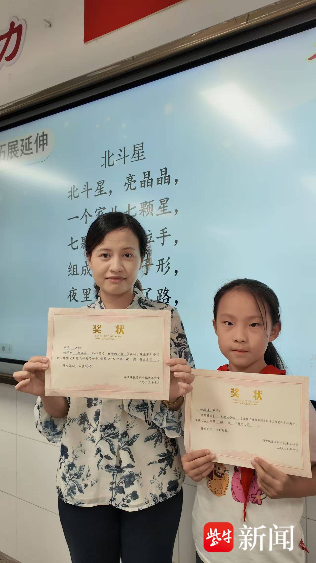 10月14日下午,扬子晚报/紫牛新闻记者对杨涵语及指导老师胡雯进行了采访。
