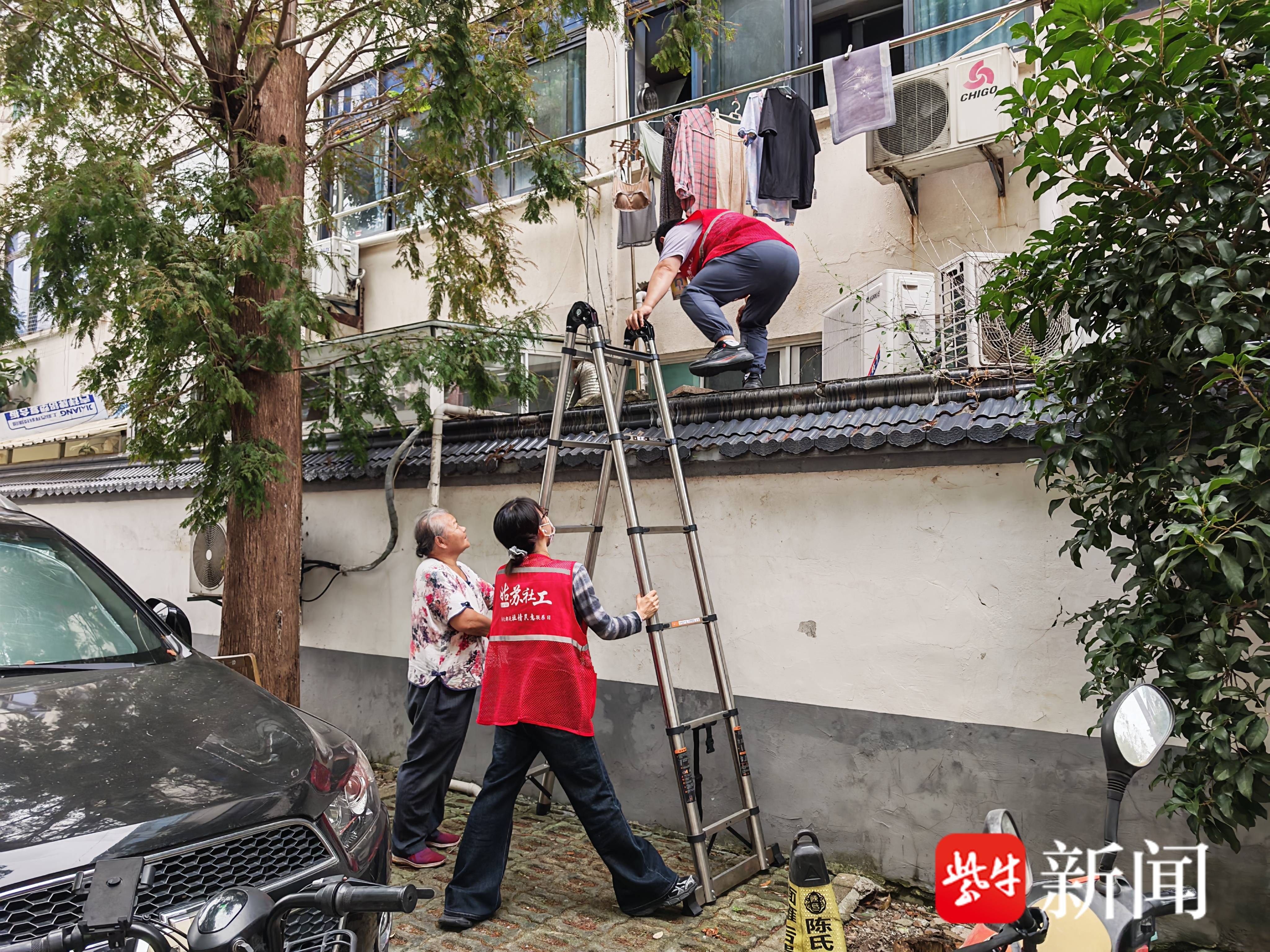 计划赶不上变化,当阿姨费力地爬上一楼楼板后,才发现陷入了“上天无路、入地无门”的窘境,既无法够到二楼的阳台,也不敢冒险跳下一楼。“阿姨,您别着急,我们马上想办法,一定安全地帮您下来!”现场,社区工作人员一边沉着冷静地安抚阿姨的情绪,让她保持镇定,一边迅速制定救援方案。为确保救援万无一失,工作人员立即兵分两路:一名工作人员留在原地,不断与阿姨交谈,分散其注意力,缓解其紧张情绪;另一名工作人员则飞奔回社区办公室,取来救援用的梯子。
