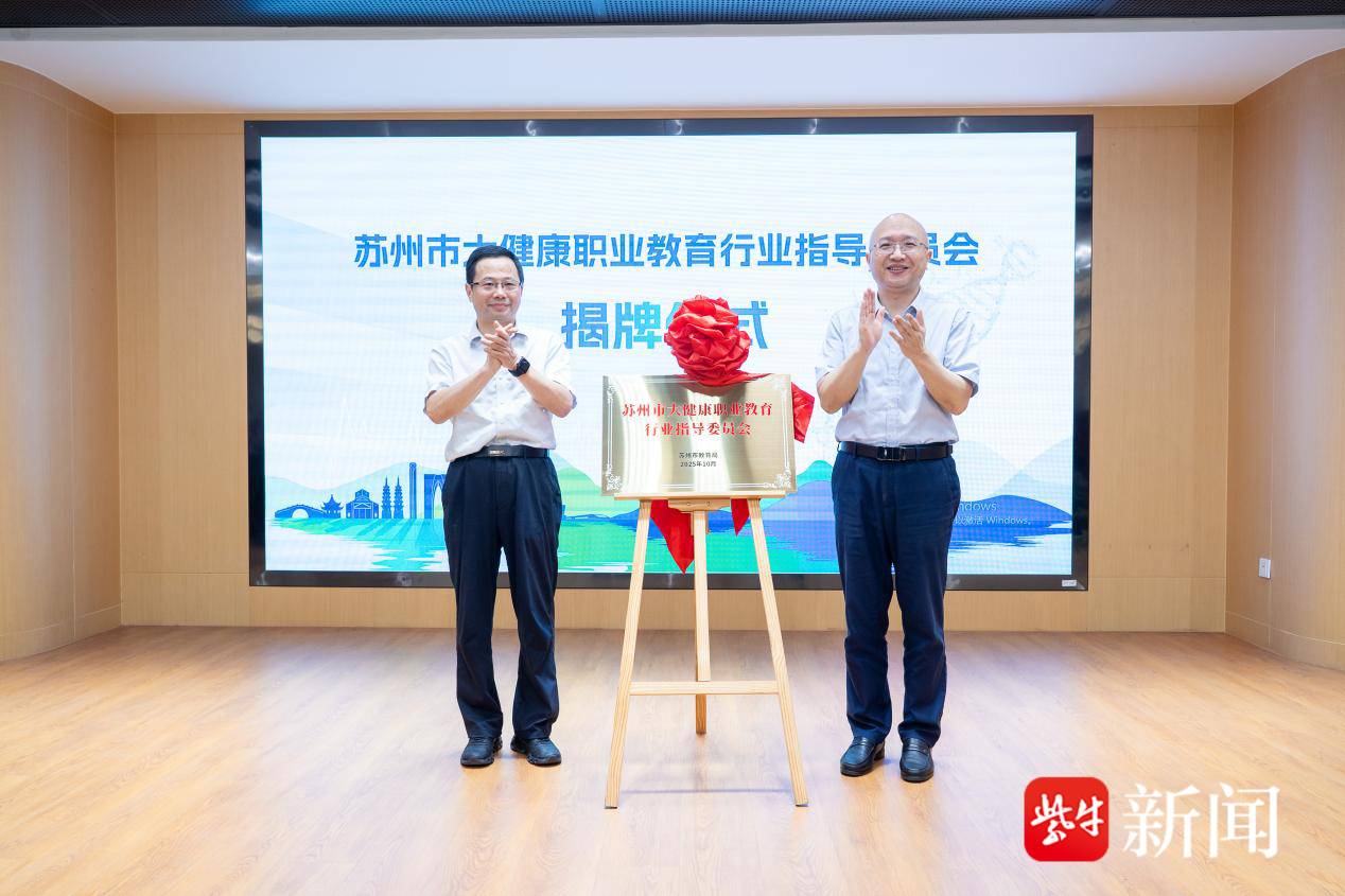 苏州市教育局四级调研员唐晓康与大健康职业教育行指委主任委员,苏州卫生职业技术学院党委副书记、院长罗晓清共同为苏州市大健康职业教育行业指导委员会揭牌。
