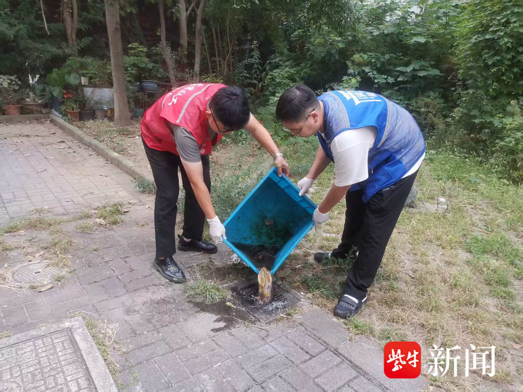 结合大扫除活动,社区同步推进灭蚊工作。工作人员和志愿者们分成多个小组,对社区各角落进行“地毯式”排查,从居民楼前的花盆托盘、积水桶到下水道口,逐一清理可能积水的区域,从源头减少蚊虫滋生。最后,专业人员携带专业喷药设备,对绿化带、垃圾桶周边、墙角、下水道口等蚊虫易聚集区域进行全面药水喷洒。