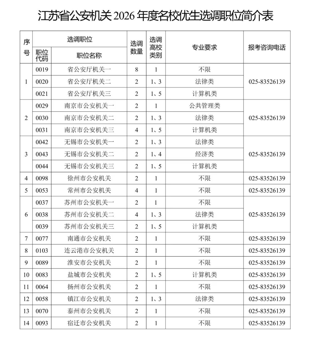 近日,省委组织部发布《江苏省2026年应届优秀大学毕业生选调工作公告》,江苏省公安机关名校优生选调工作同步启动,全省公安机关选调名校优生56名。