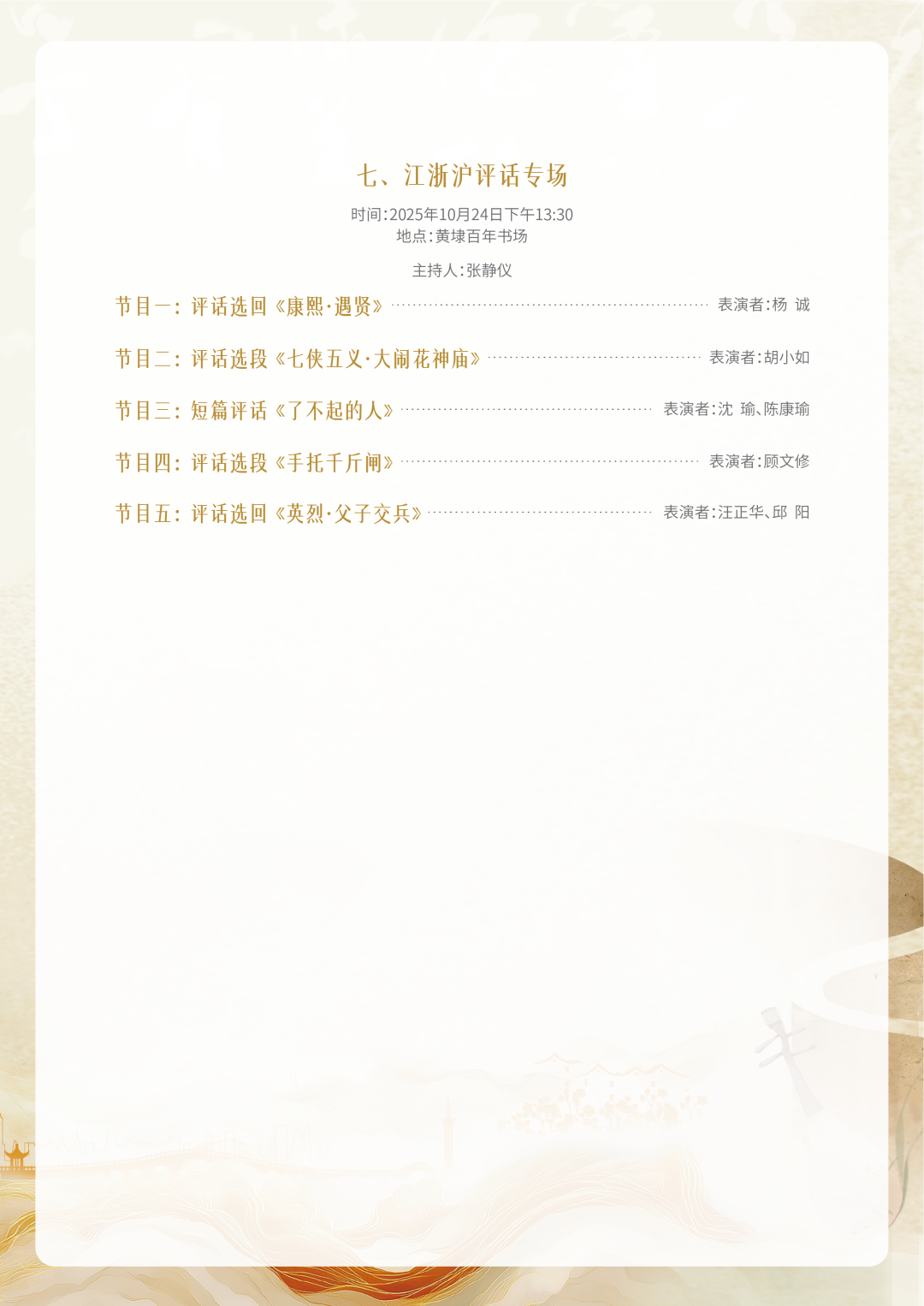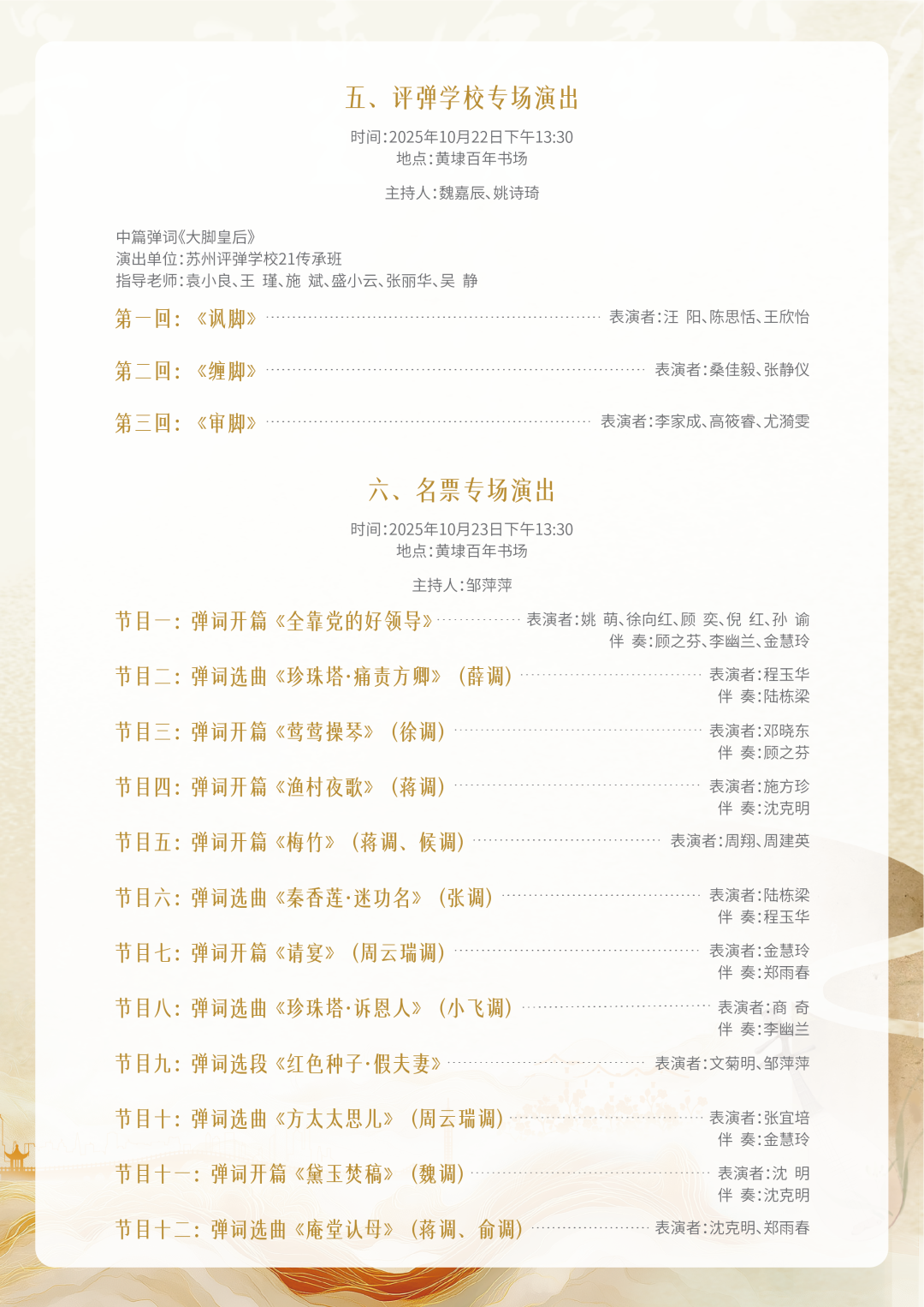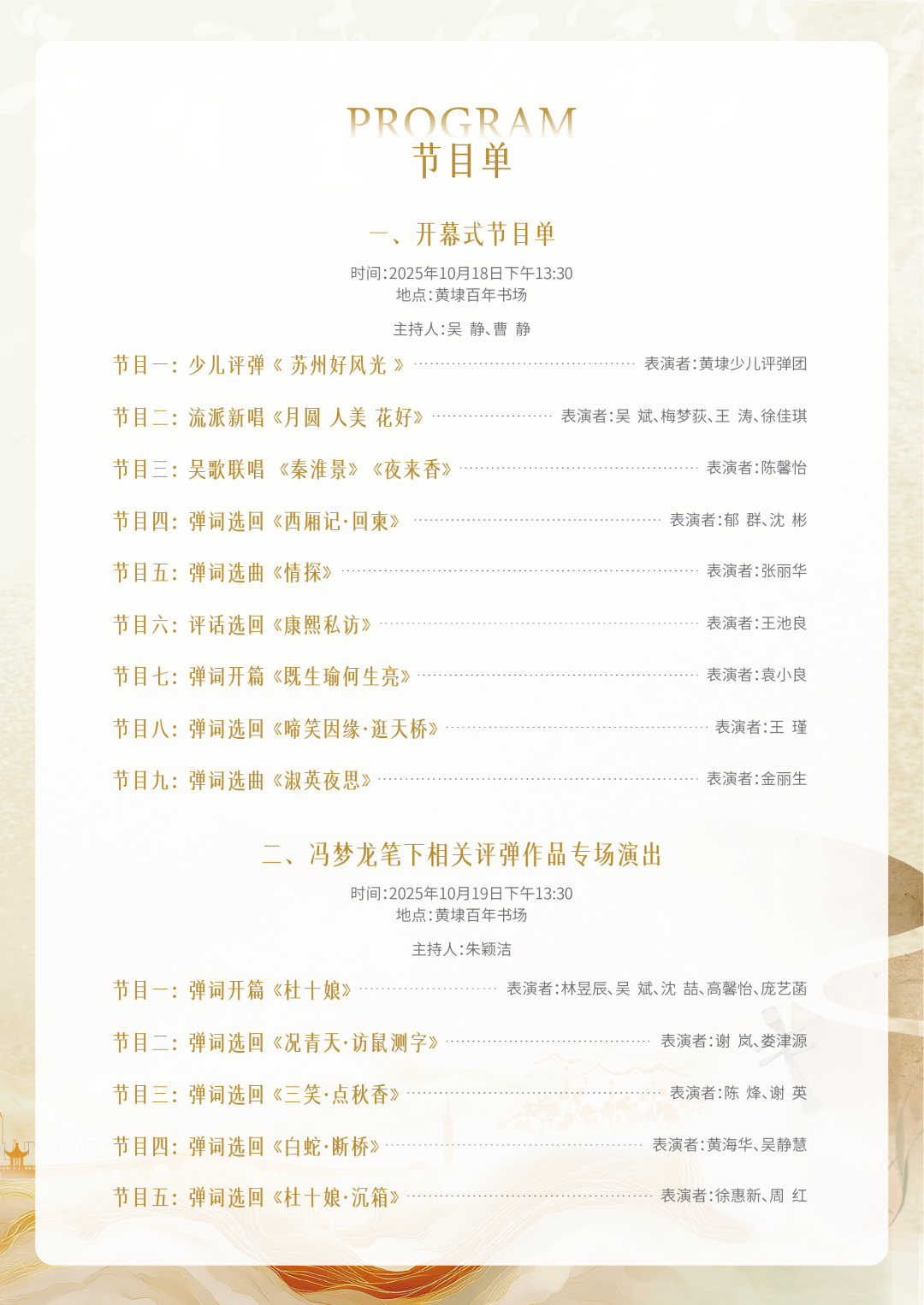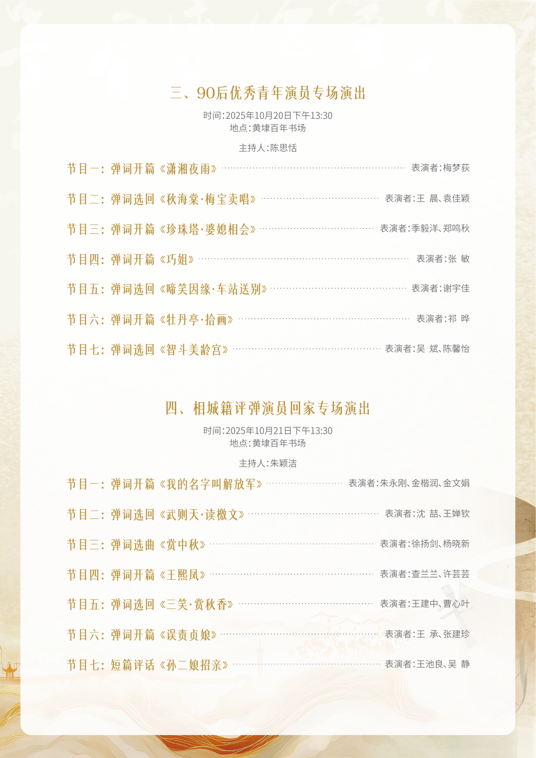 据悉,本届黄埭“苏州评弹”周活动时间为10月18日至10月24日,期间将陆续推出黄埭“苏州评弹”周首场演出、冯梦龙笔下相关评弹作品专场、90后优秀青年演员专场、相城籍评弹演员“回家”专场、评弹学校专场以及名票专场等7场不同主题的评弹专场演出,演出阵容强大,汇聚了84位评弹演员,其中中国曲艺最高奖“牡丹奖”获得者8人、国家一级演员18人,将为观众呈现一场场精彩的评弹视听盛宴。