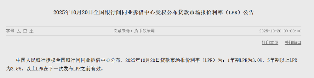 10月20日,据央行官网,中国人民银行授权全国银行间同业拆借中心公布,2025年10月20日贷款市场报价利率(LPR)为:1年期LPR为3.0%,5年期以上LPR为3.5%;两者均维持不变。