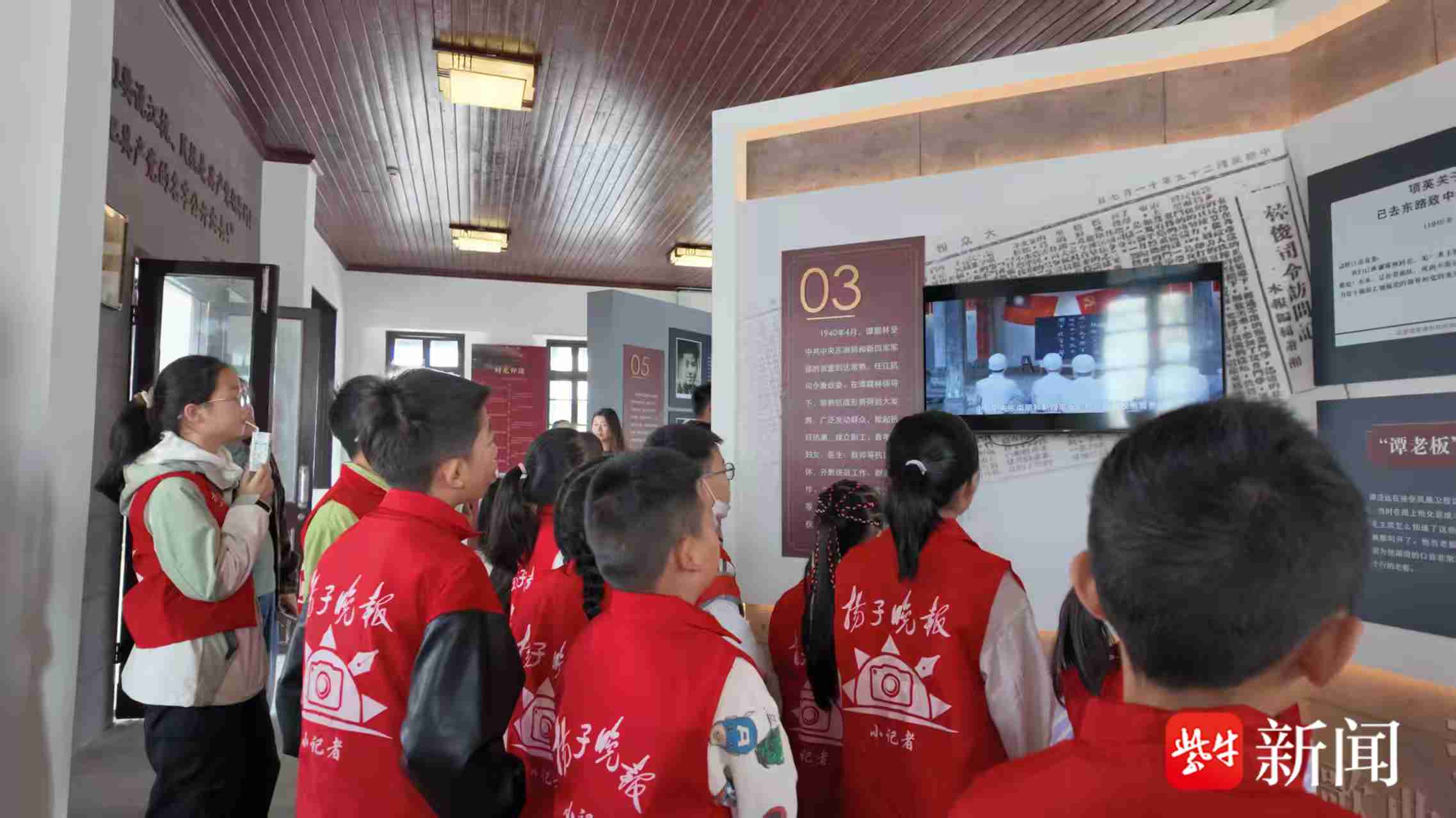 在陈家伟的讲述中,小记者们了解到,1940年,新四军领导人谭震林曾化名“林俊”,在这座老建筑里向群众发表抗日演讲。他用通俗的语言分析形势、鼓舞民心,将共产党“为人民服务”的宗旨和“抗日必胜”的信念深深植入了江南百姓的心中。“这房子看起来旧旧的,没想到经历过这么多波澜壮阔……”苏州市杨枝小学校小记者二(1)班李皓宇仰头看着老房子,小声对同伴说道。从建筑到故事,从故事到精神,小记者们在四面厅里完成了一次与历史的对话,也对脚下这片土地的红色基因有了更真切的认知。