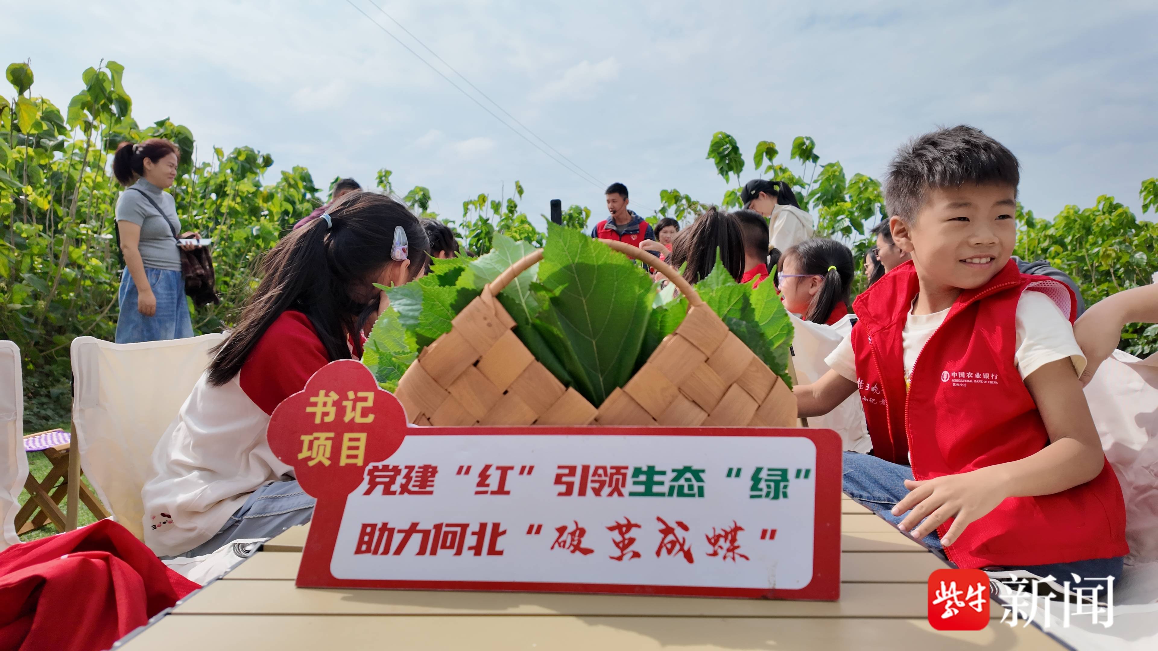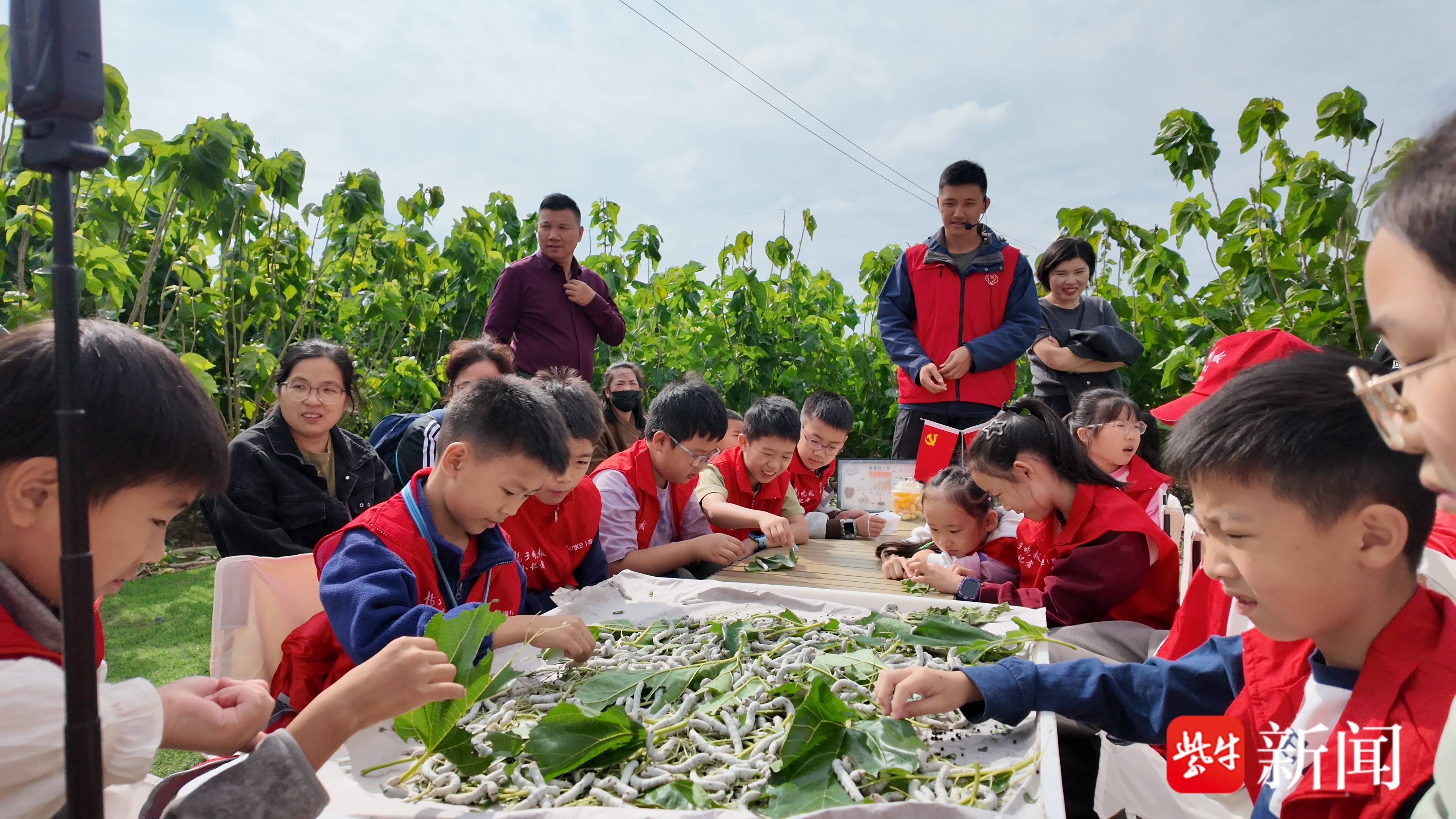 离开四面厅,田野清香扑面而来。找鸭蛋、炸桑叶、抱小羊……一连串互动体验让孩子们兴奋不已。在久硕家庭农场,桑蚕养殖区成了最“吸粉”的地方。白胖胖的蚕宝宝伏在鲜嫩桑叶上,一边慢慢蠕动,一边“沙沙”作响,孩子们不约而同发出惊呼。“大家仔细看,蚕宝宝的一生藏着不少小秘密呢!”在陈家伟的讲解下,小记者们了解了蚕宝宝从卵到蚕、再到蛹和蛾的完整生命周期,还惊讶于一只蚕竟能产下400到500粒卵。