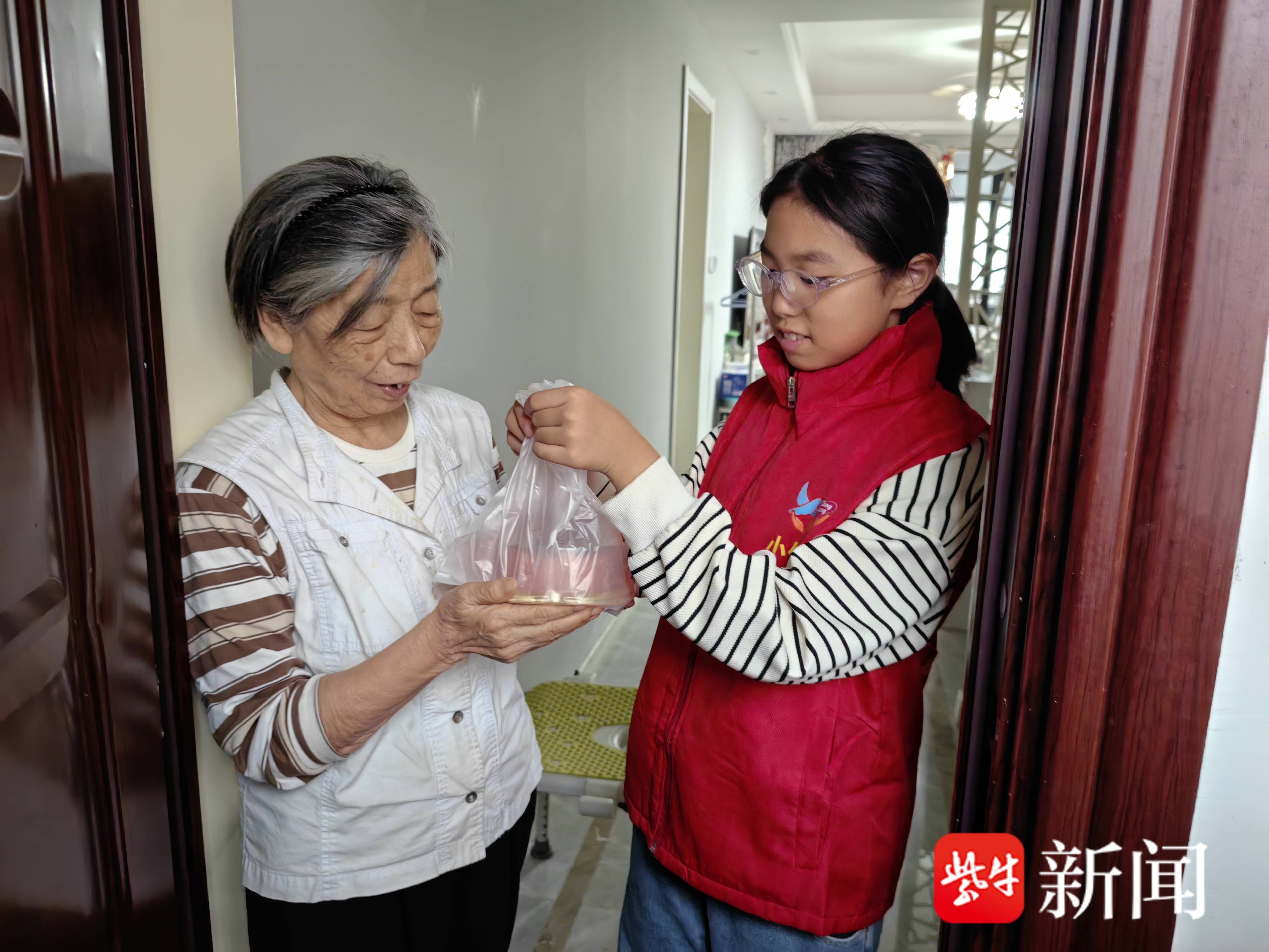 制作完成后,孩子们化身“小小志愿者”,带着包装好的重阳糕分组前往辖区高龄、独居老人家中。“奶奶,这是我们自己做的重阳糕,您尝尝!”接过孩子们递来的糕点,老人连连道谢:“谢谢孩子们,奶奶也希望你们茁壮成长、学习进步!”