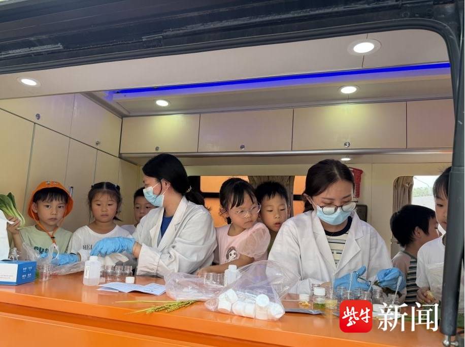 科普结束后,师生们来到快检车前开启“食安探秘”之旅。检验检测中心工作人员向大家介绍快检知识与快检车功能,并进行快检体验。30名小朋友分成三组,依次登上快检车参与快检实操。工作人员从小朋友自带的青菜、黄瓜等蔬菜中抽取样品,现场分步演示农药残留检测流程——从样品处理、试剂添加,到仪器检测、结果读取,每一步都细致讲解。孩子们近距离观察检测过程,部分学生还亲手参与样品称重等简单操作,亲身感受食品安全检测的严谨。