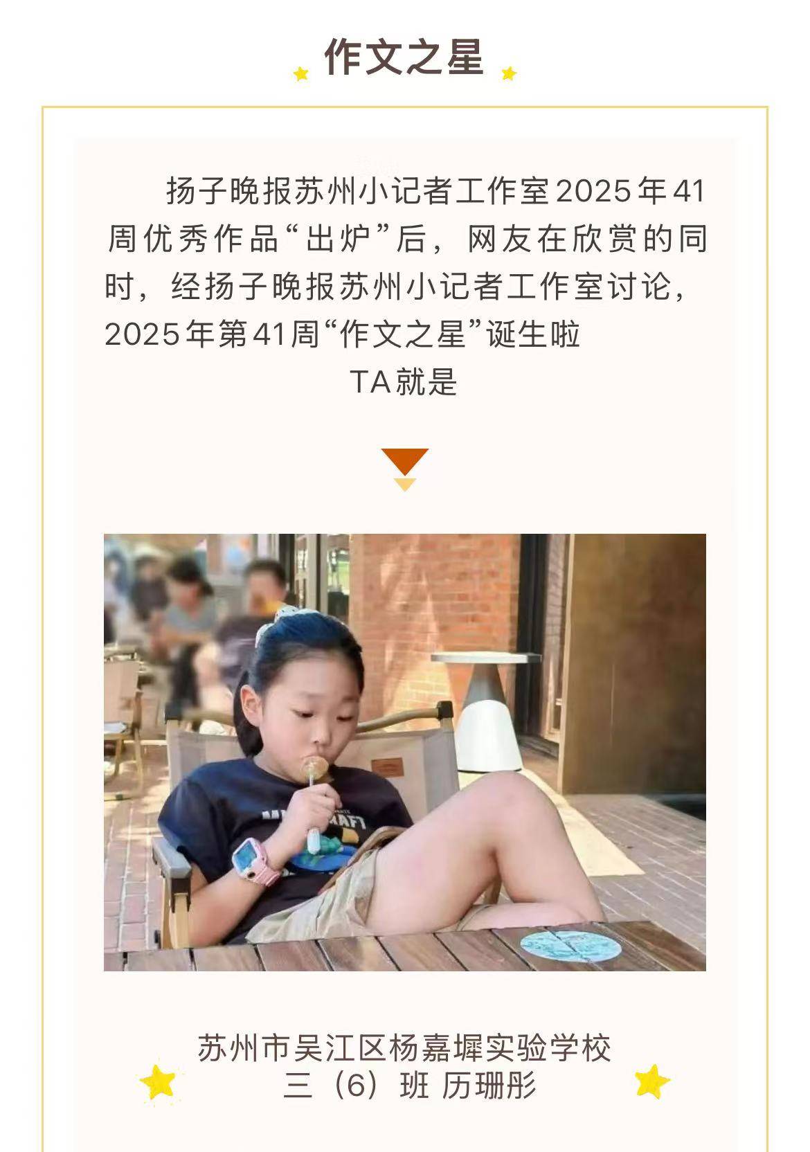 “我看见地面上飞来了几只漂亮小鸽子,嘴里衔着小树枝,我猜想它们应该要搭建一个温暖漂亮的小窝吧。”这样生动有趣的文字出自苏州市吴江区杨家墀实验学校三(6)班历珊彤的获奖作文中。文中,她通过充满童真的视角记录了上学路上遇到的各种有趣小事,让读者忍不住也想去走一走她上学的那条小路。同时,也让她荣获了扬子晚报苏州小记者工作室第41周“作文之星”荣誉称号。