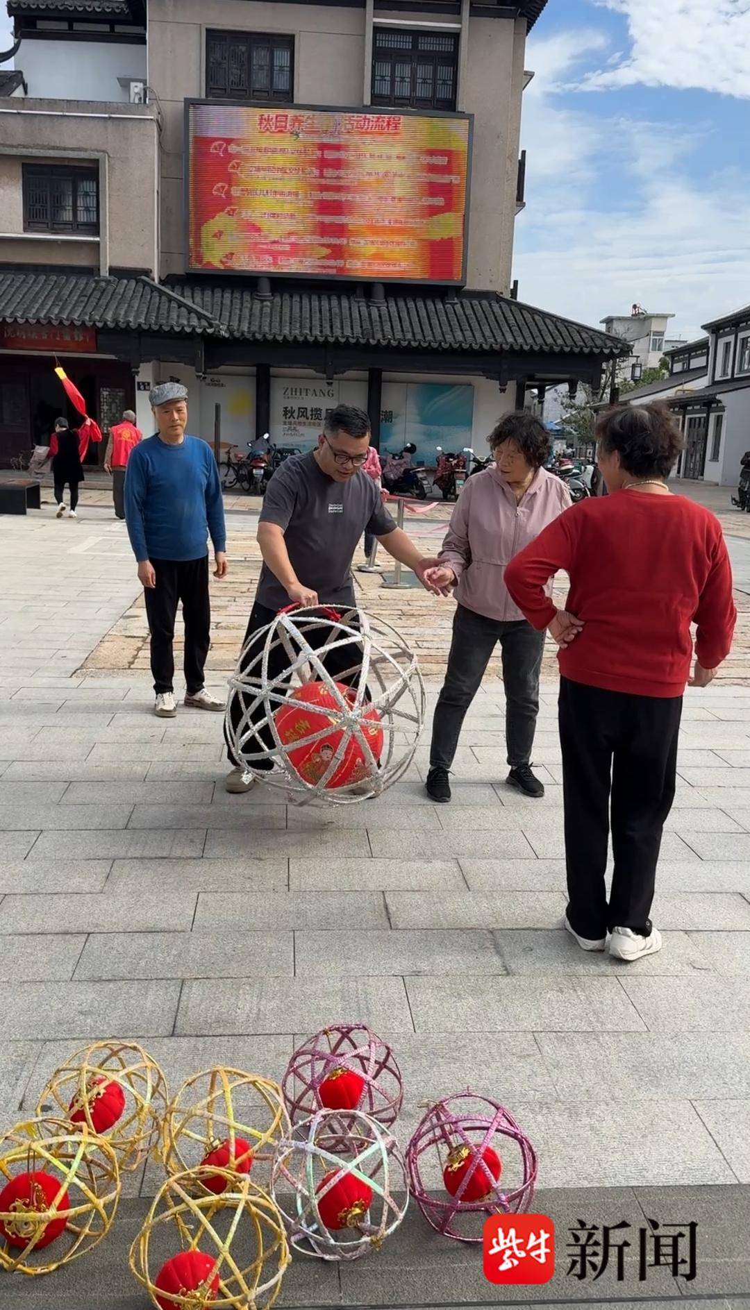 银杏树下,常熟市级非遗传承人顾卫强老师正在带领居民体验滚灯技艺。从握灯、起步到绕臂、转身,动作一招一式皆显功力。孩子们兴奋地模仿,家长们笑着加入,在光影闪动间感受传统运动的趣味与活力。顾老师笑着说:“滚灯讲究刚柔并济,既能锻炼身体,也能养神怡心。”