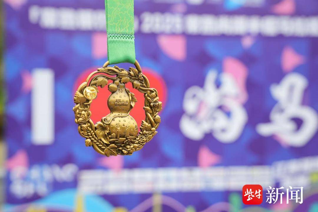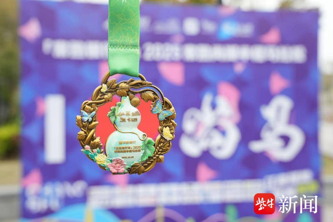 尚马以“福”为引,将“江南福地”文化融入赛事每个细节。奖牌以圆为形,寓意天地圆满、万物和谐,中心镶嵌葫芦造型“福禄”双全,好运相伴,奖牌外缘枫叶轻绕,将常熟独有的秋色枫情融入其中,叶脉间点缀盛放的牡丹花簇,翩然舞动的蝴蝶与饱满金黄的麦穗,牡丹为花中之王,代表富贵圆满、吉祥幸福,金黄麦穗,礼赞丰收的喜悦。蝴蝶轻舞,带来好运,寓意在这条福蝶赛道上,每个人皆可破茧成蝶、焕获新生。右上一只蝴蝶亦可单独取下,可作为胸针装饰,化作一份可赠予、可珍藏的祝福,让幸福触手可及、可传、可赠。蝴蝶可在奖牌轨道上轻盈滑动,在“福蝶赛道”上翩翩起舞的蝴蝶,见证每位跑者破茧成蝶的蜕变时刻。奖牌背面,将“福禄双全”的美好寓意融入其中。葫芦轮廓之上映现各字体“福”字,福叠福、福满福,寓意福禄双全、幸福相伴。