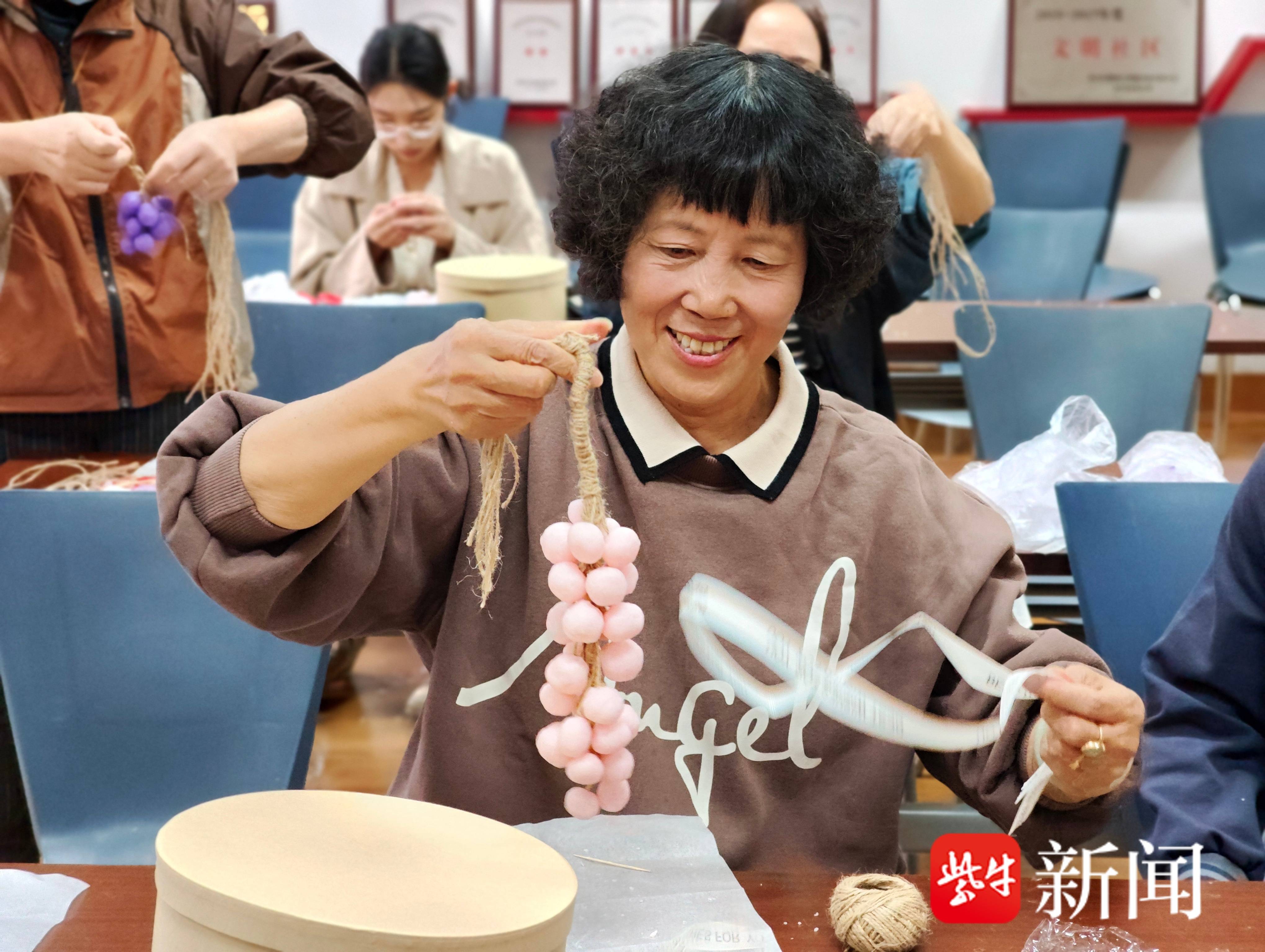 认真学习后,大家迫不及待地开始了自己的制作体验。从揉捏“葡萄粒”,到给每颗“葡萄”穿入麻绳固定,再到将一颗颗“葡萄”绑成一串,每一步都充满了乐趣与挑战。大家耐心仔细地揉捏、捆扎,有的专注忙碌,有的互相帮助,经过1个多小时的精心制作,一串串或饱满,或修长的“葡萄串”在大家手中诞生。