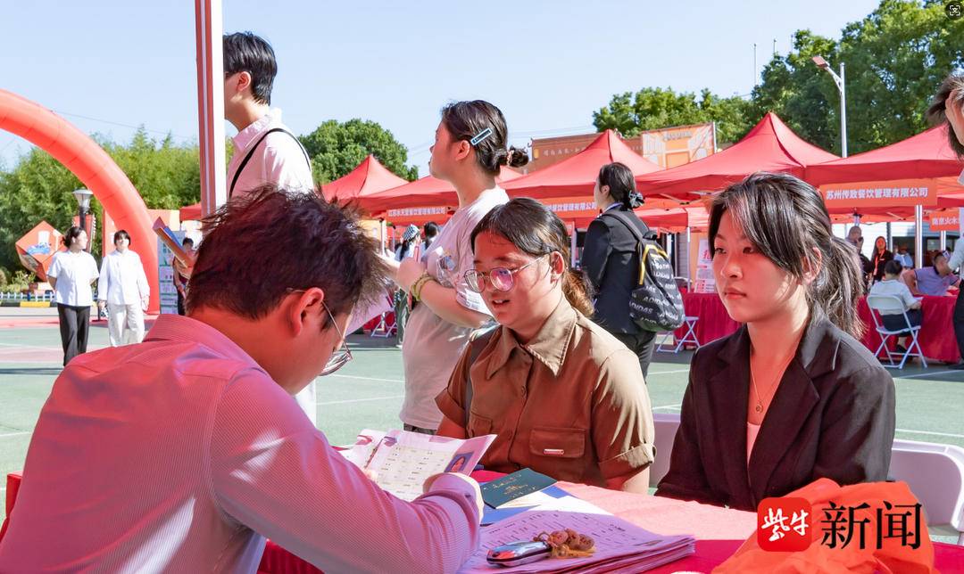双选会现场,企业拉起红色横幅,整齐摆开招聘展位。学生们手持简历,在各个展位间有序穿梭,不时驻足询问岗位详情、薪资待遇和发展路径。在江苏小厨娘餐饮管理有限公司的展位前,学生排起了长队,招聘主管李女士一边翻看简历,一边与学生交流。