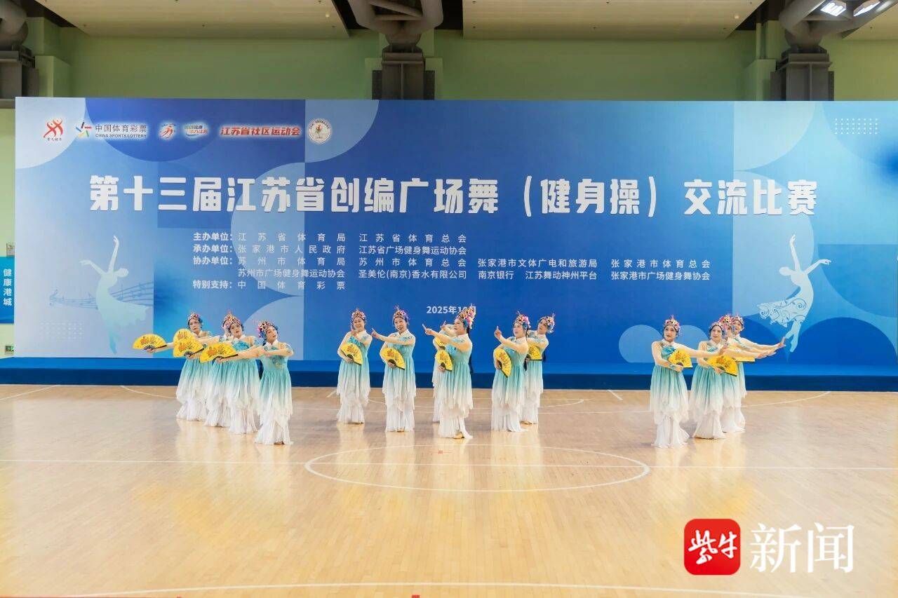 由江苏省体育局、江苏省体育总会主办的第十三届江苏省创编广场舞(健身操)交流比赛在张家港职工文体中心举行,来自全省13个市代表队,20支队伍,300余名广场舞爱好者参加比赛。
