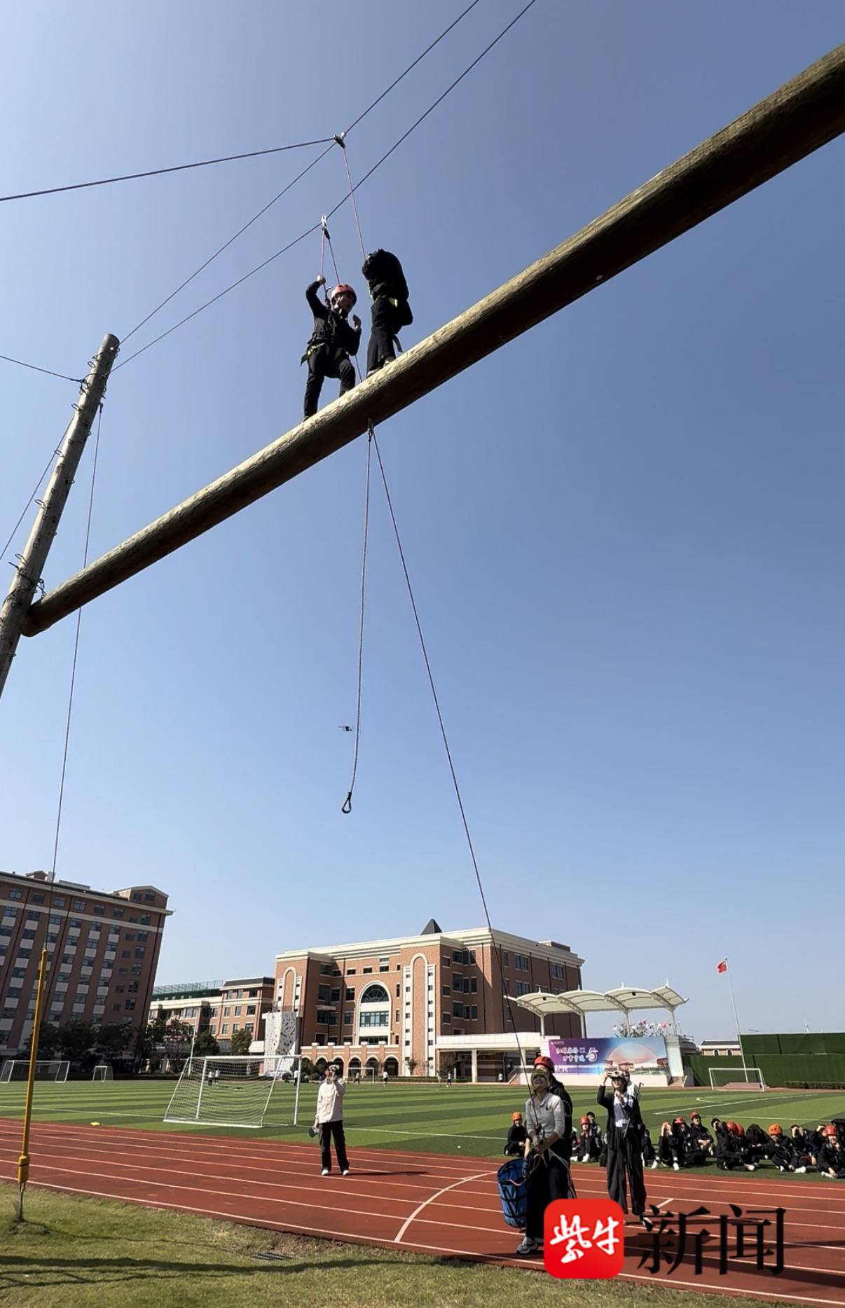 六年级(1)班的周子翔还记得那天的场景——校长从天而降的那一刻,全场先安静了一秒,然后爆发出尖叫。“太震惊了,没想到他真的敢滑下来。”他说。在初一(2)班的徐欣瑶眼里,校长不只是“勇敢”,更是一个“有趣的大人”。她觉得校长总是笑盈盈的,每次见面都会主动和学生打招呼,“不像别的校长那样严肃”。六年级(2)班的王妍浠回忆自己第一次玩高空独木桥时,“腿抖得厉害”,但在下面同学和老师的加油声里还是一步步走完,“第二次就一点也不怕了”。