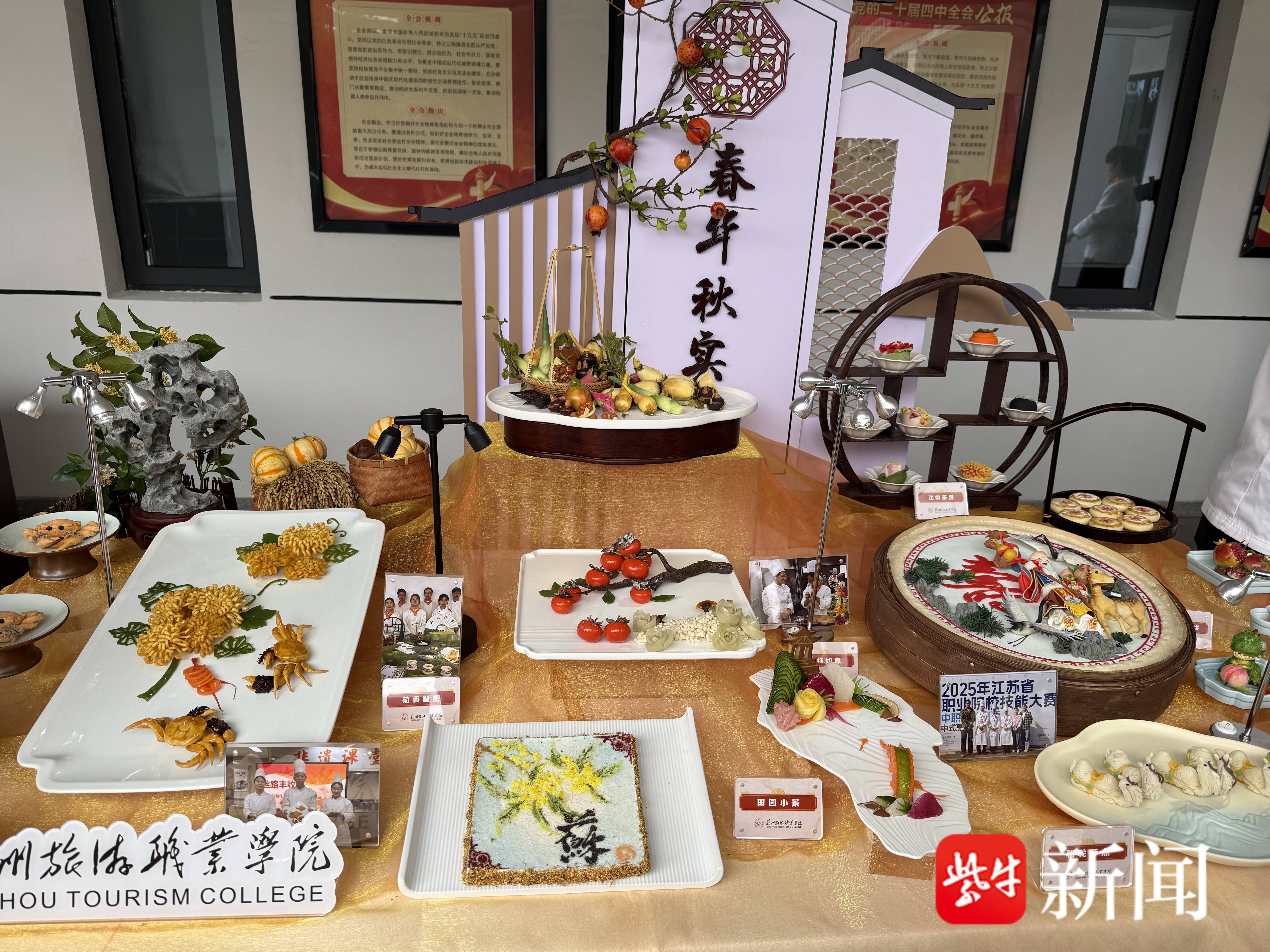 在校园厨艺展示摊位上,苏式点心“卷”出新高度。大闸蟹造型的蟹黄酥栩栩如生,蟹钳分明;桂花糯米糕撒着干桂花,清香扑鼻;苏式园林风格的摆盘样式新颖,堪比微缩艺术品;更有南极仙翁造型的面饼和融入“苏超”元素的面点,引得参观者频频驻足拍照。