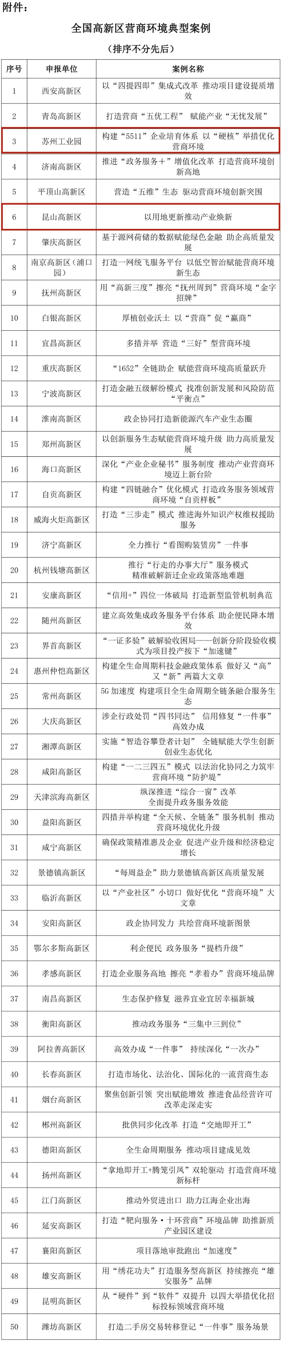苏州入选的两项案例,苏州工业园申报的为《构建“5511”企业培育体系 以“硬核”举措优化营商环境》,昆山高新区申报的为《以用地更新推动产业焕新》。
